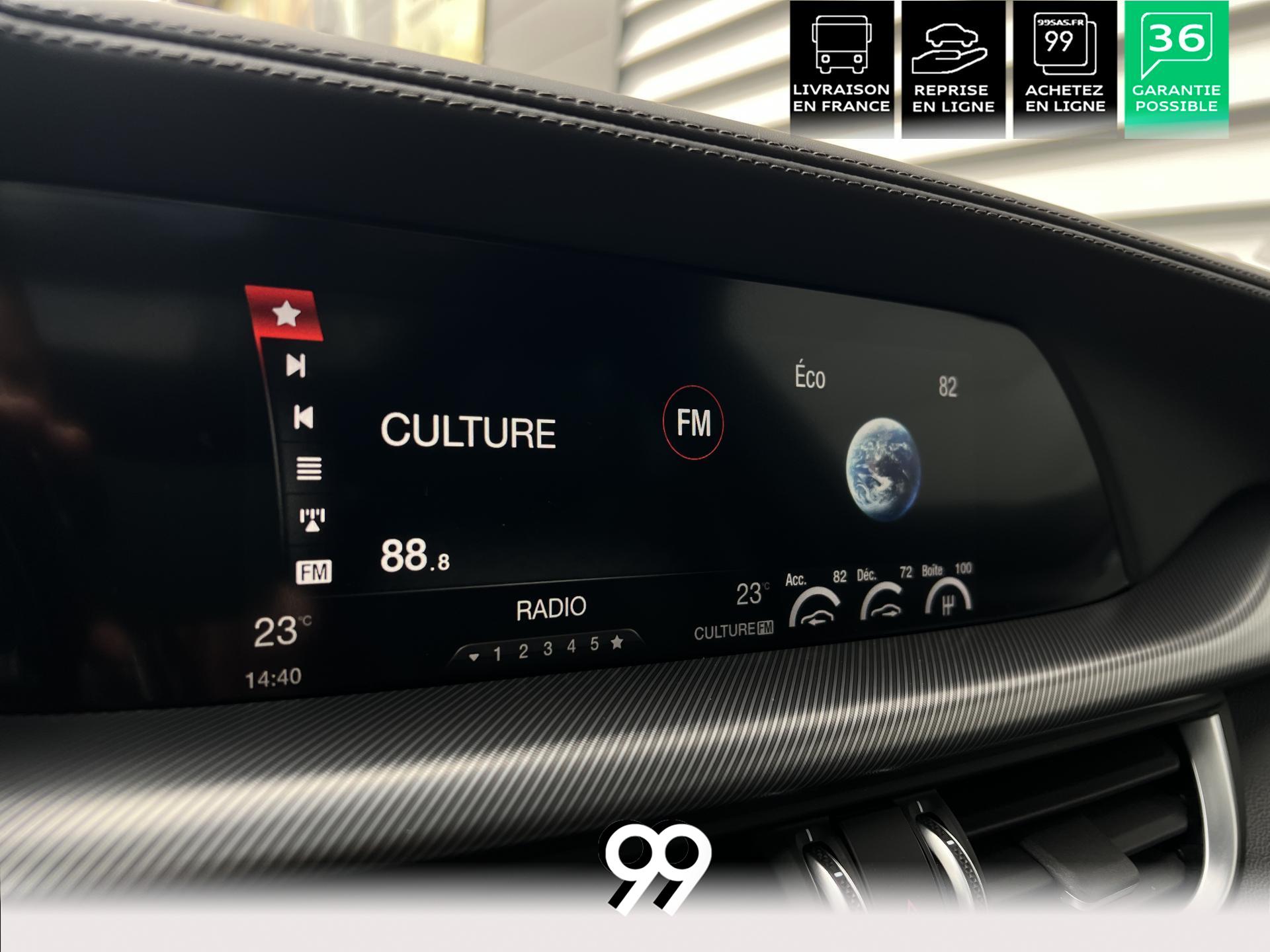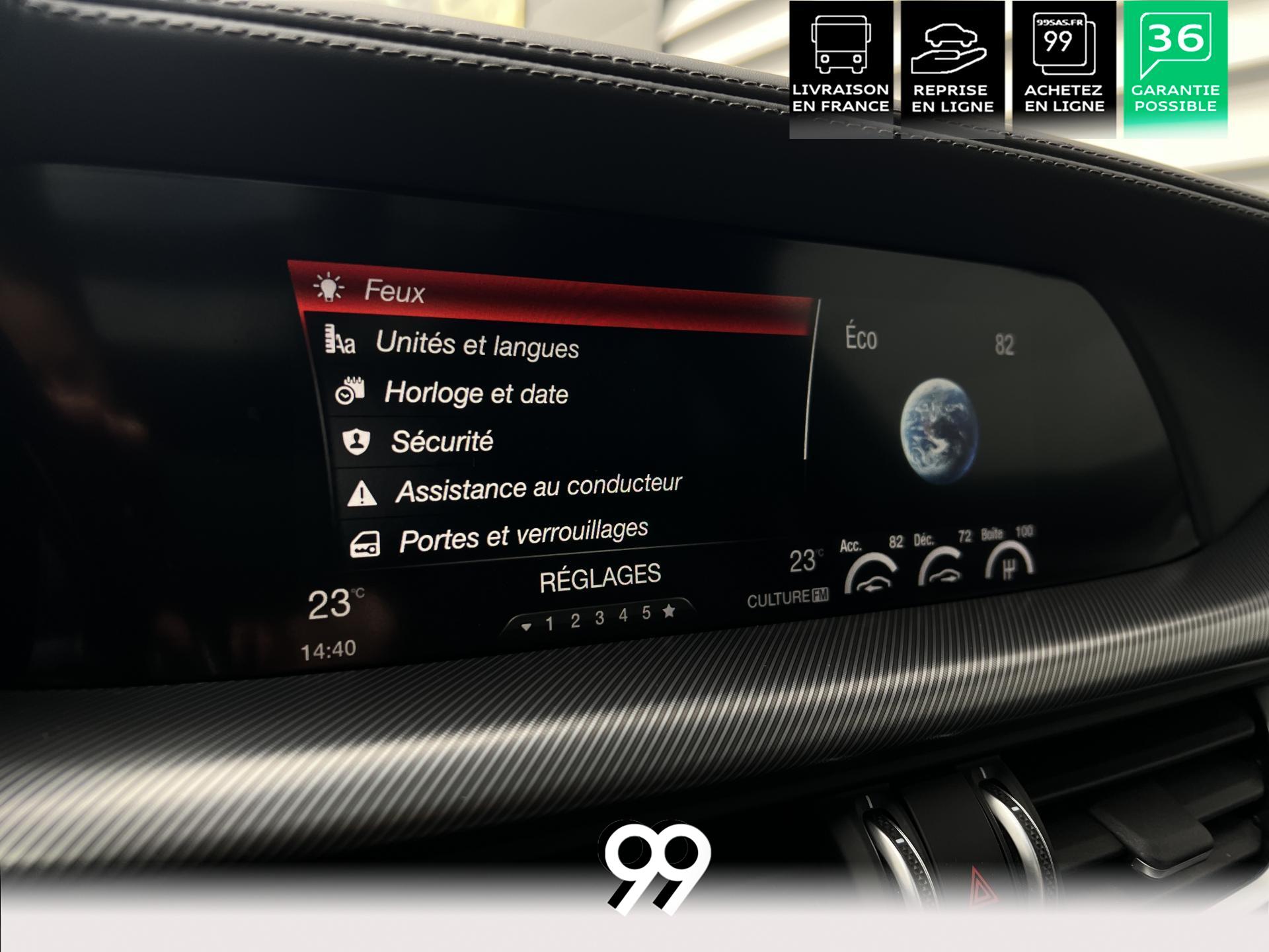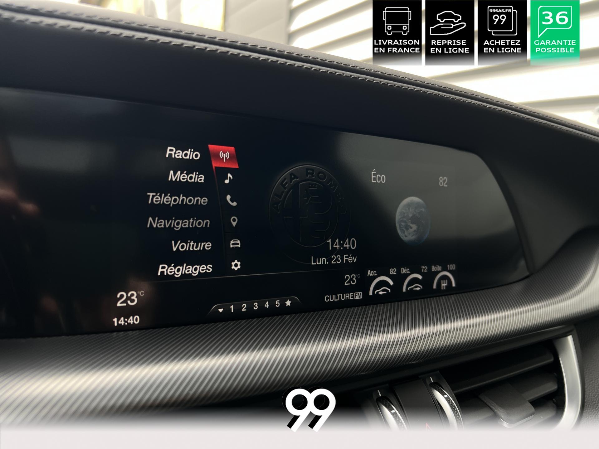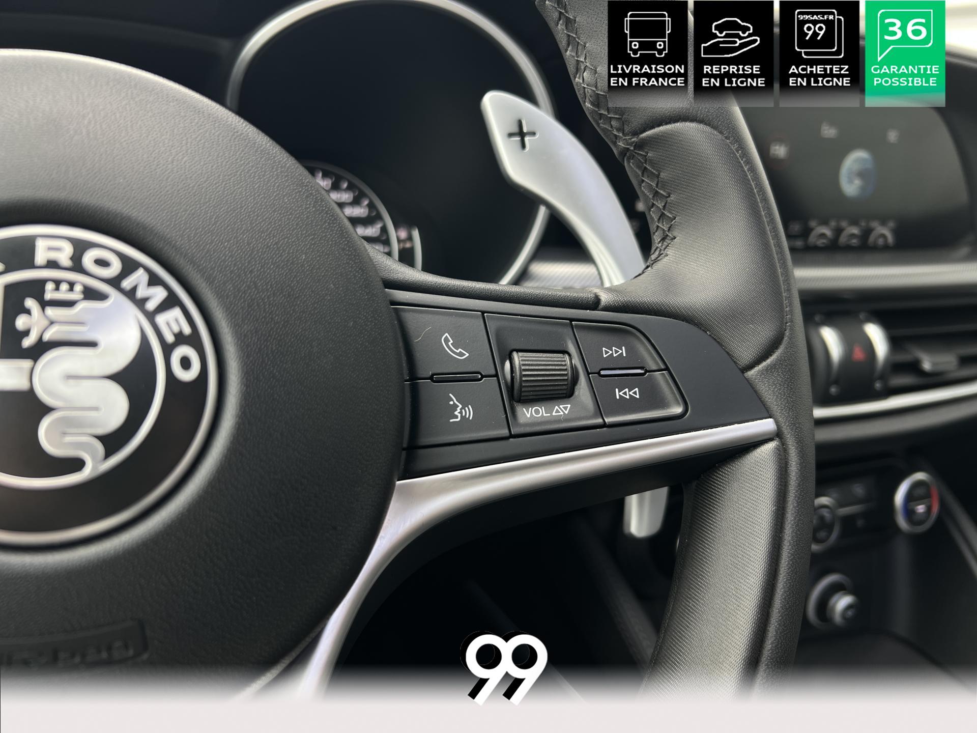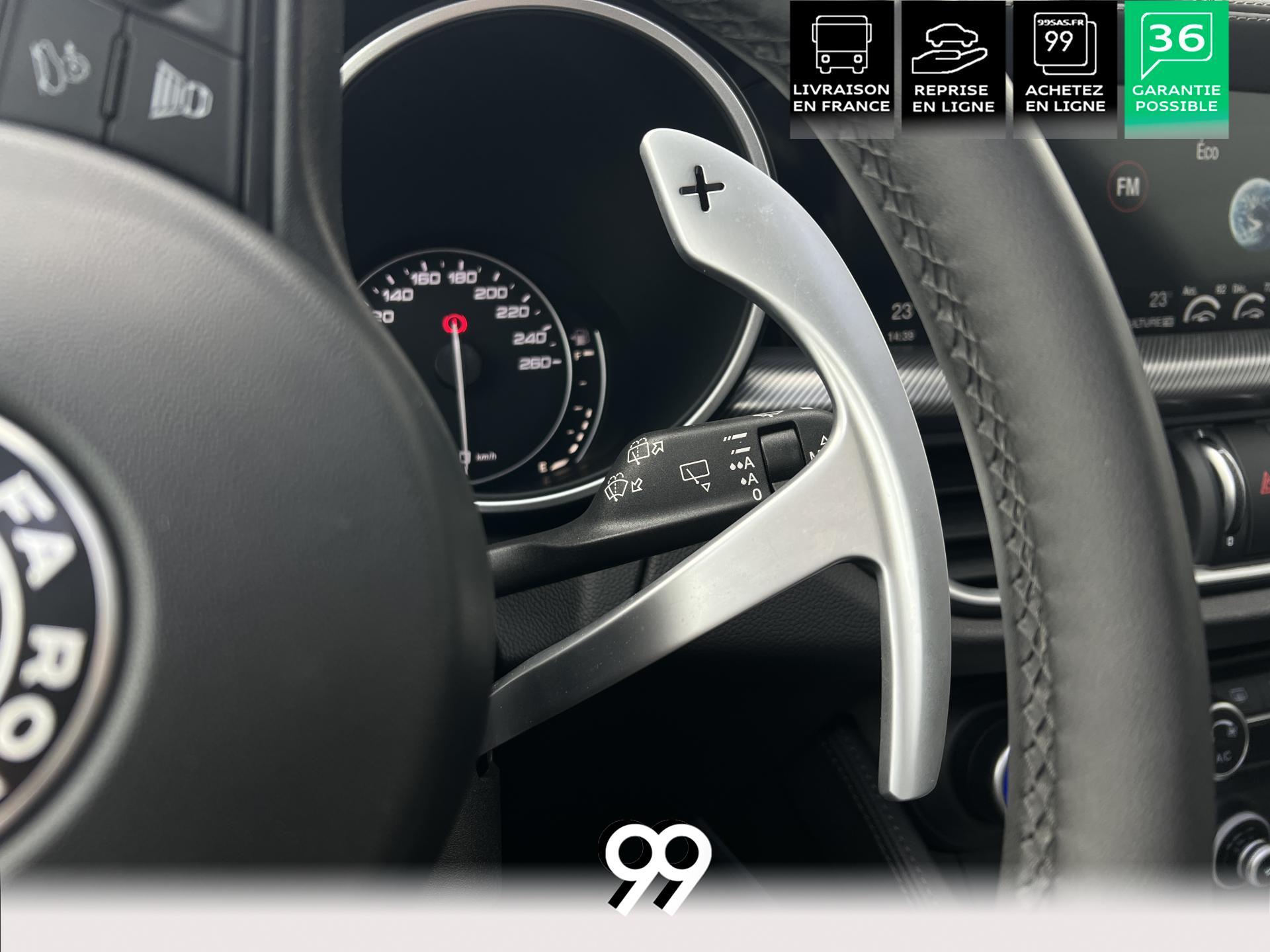 Régulateur adaptatif avec conduite semi-autonome, pack Driver Assistance Plus (caméra, radars, angle mort), suspension dynamique Alfa et palettes aluminium au volant.