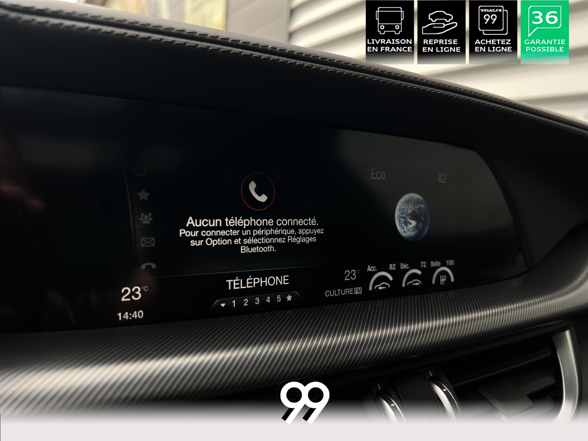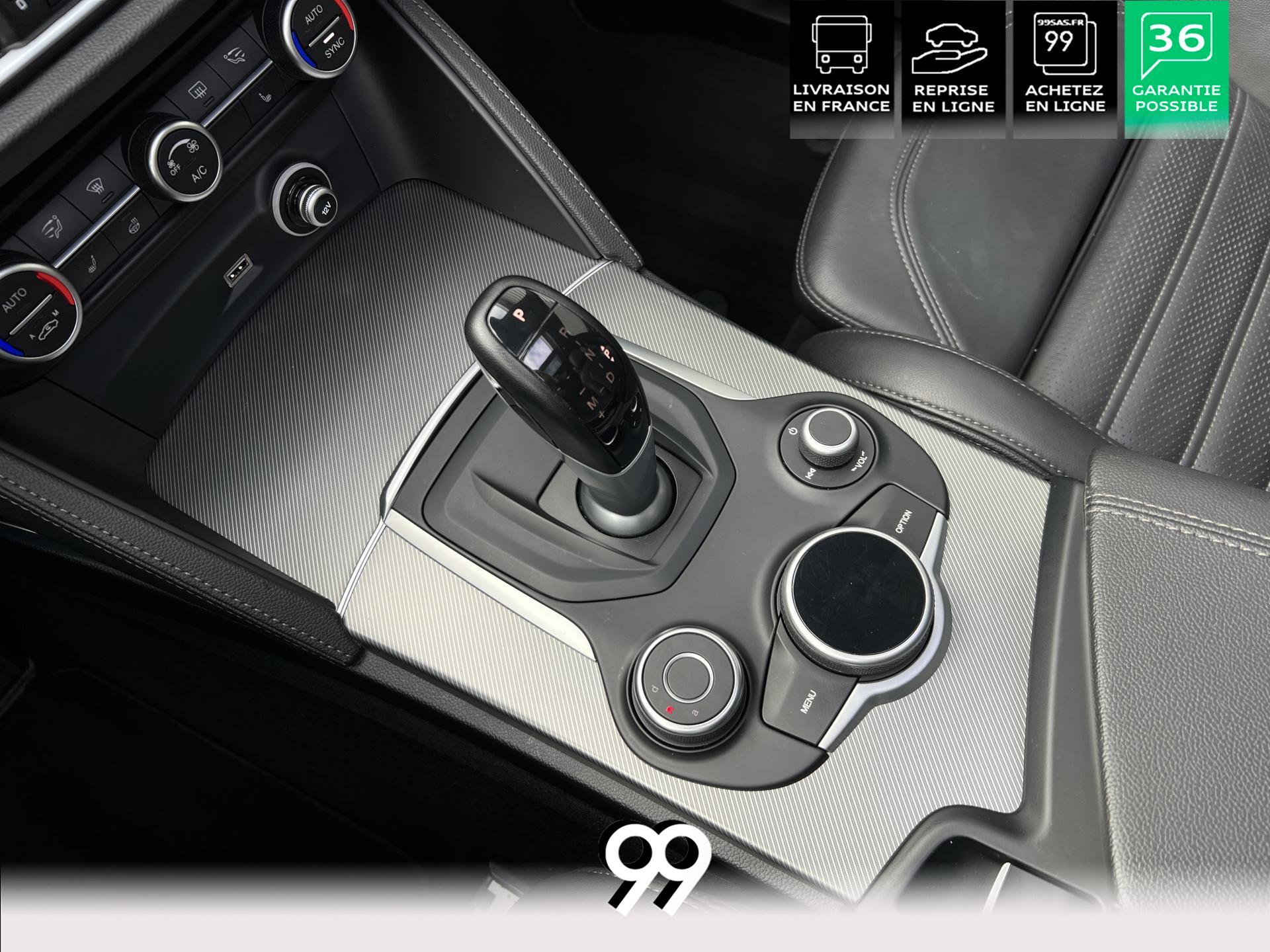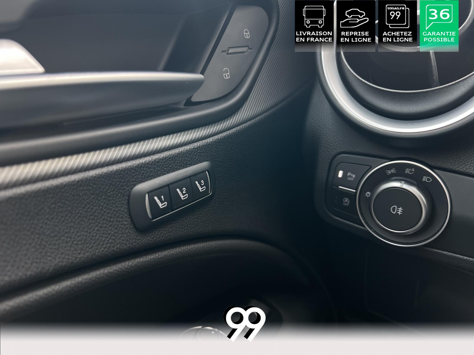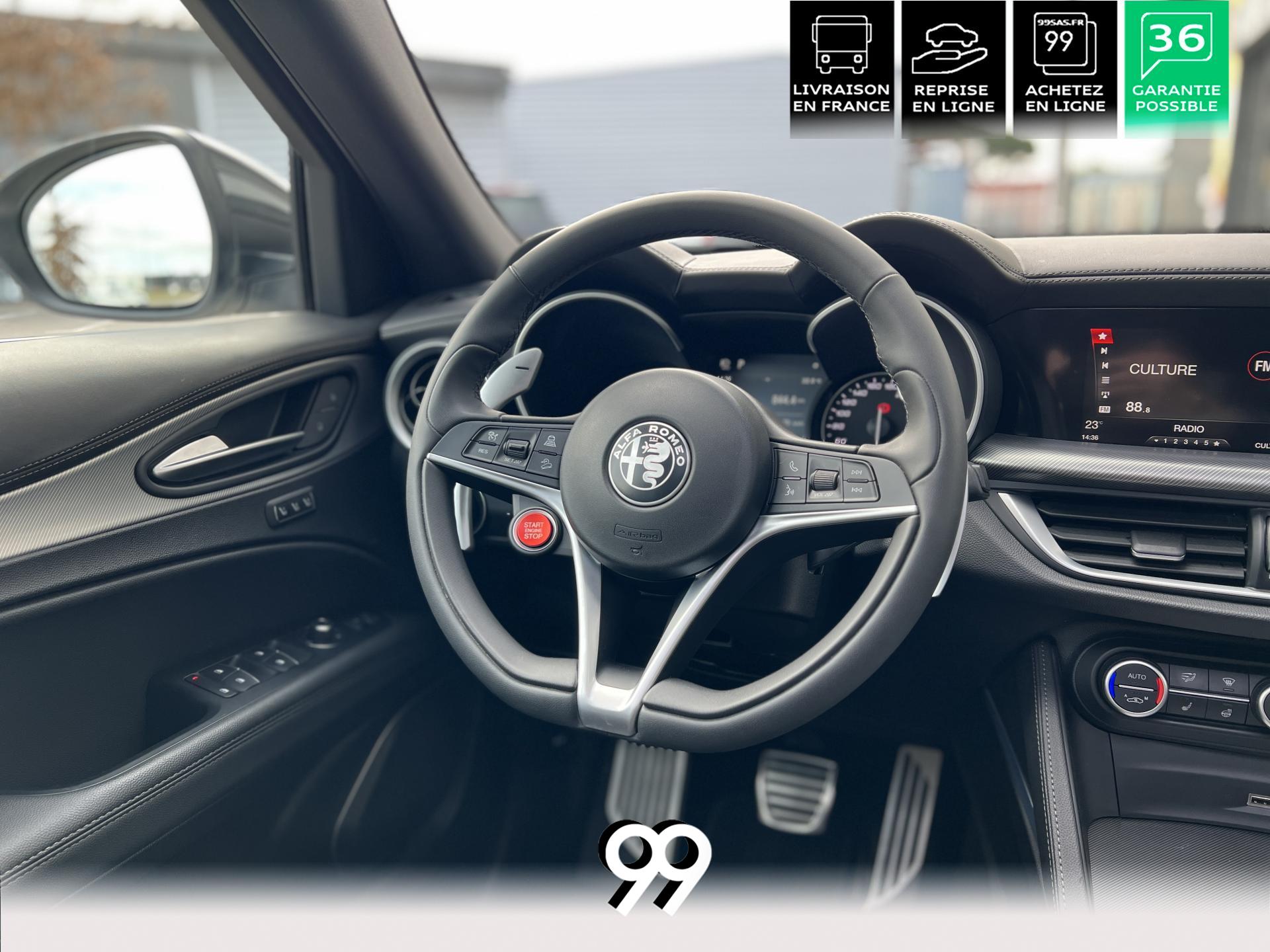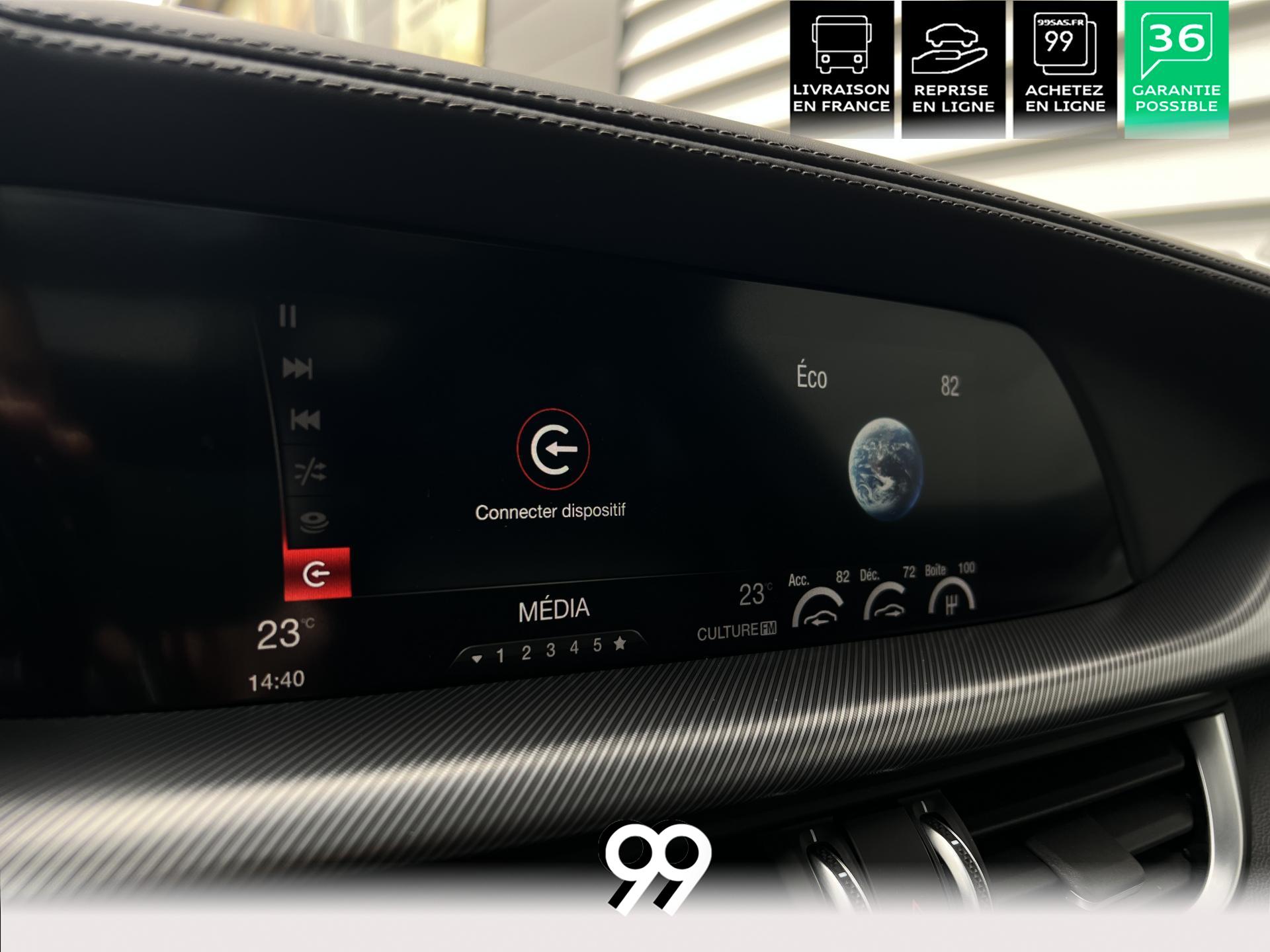 Régulateur adaptatif avec conduite semi-autonome, pack Driver Assistance Plus (caméra, radars, angle mort), suspension dynamique Alfa et palettes aluminium au volant.