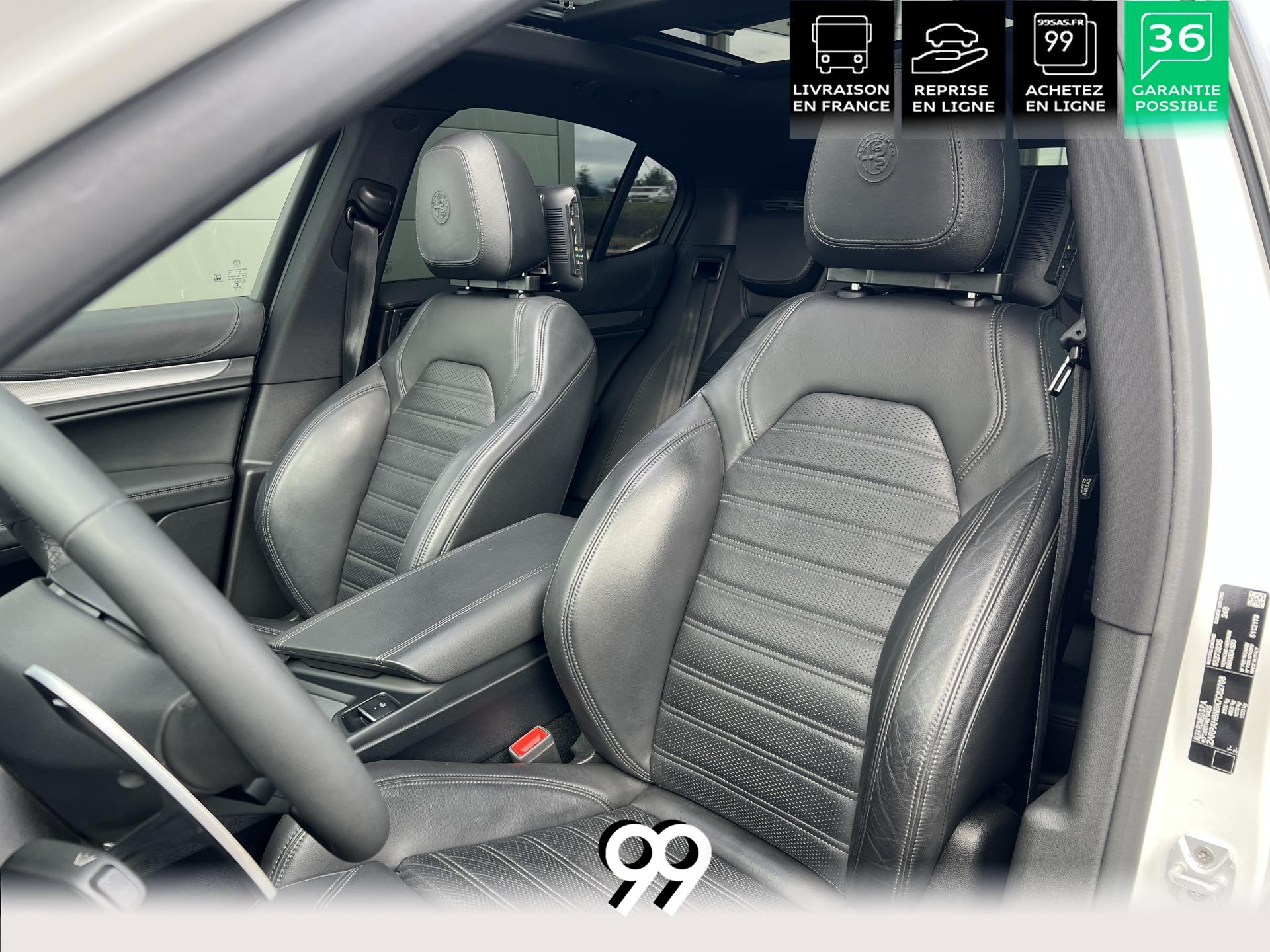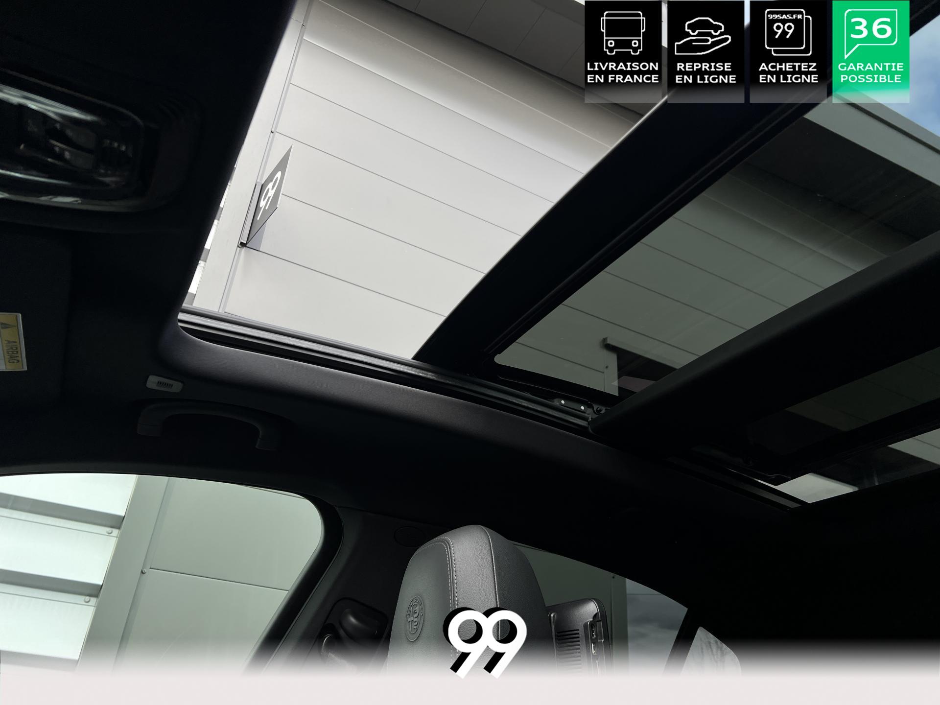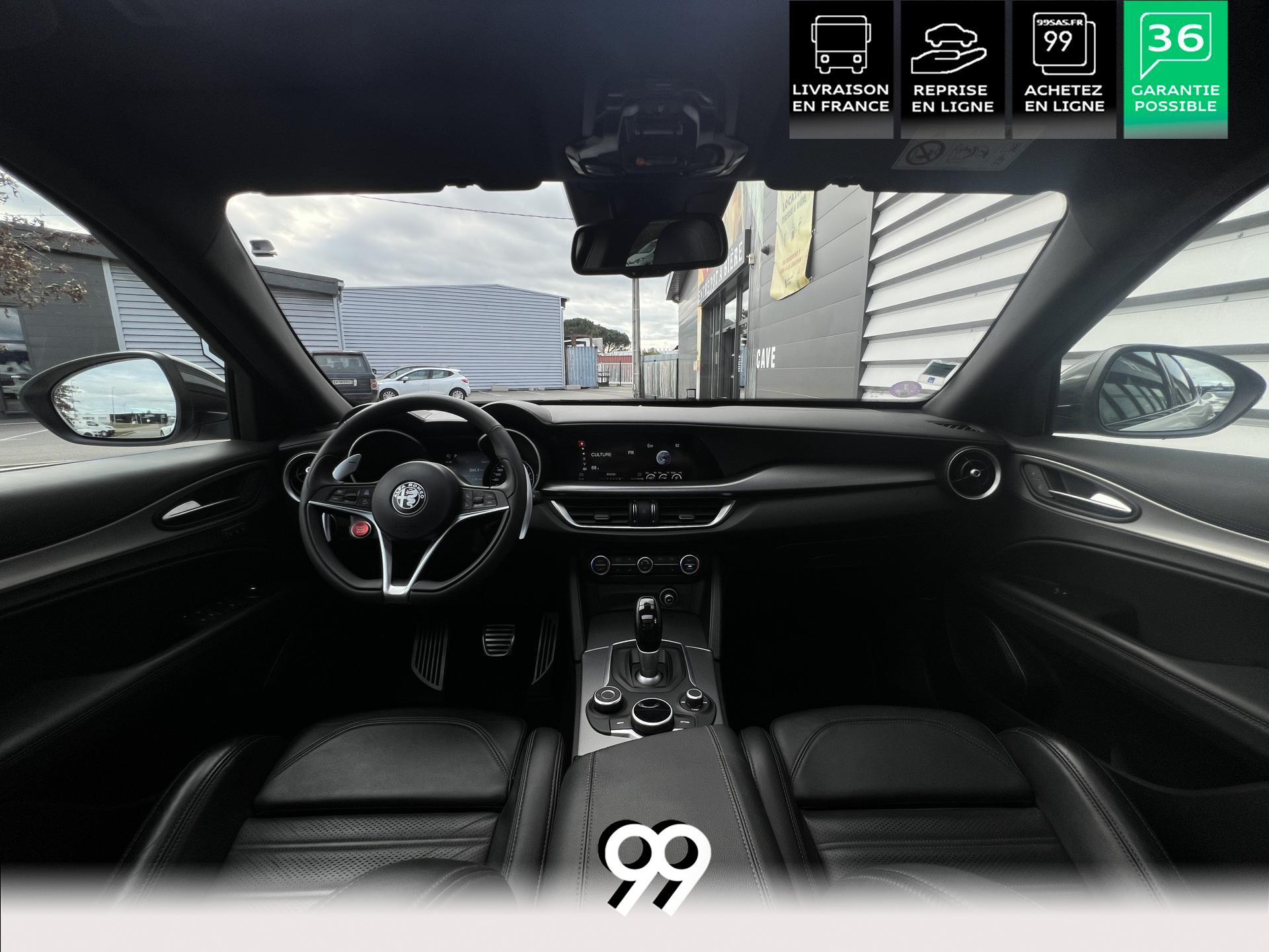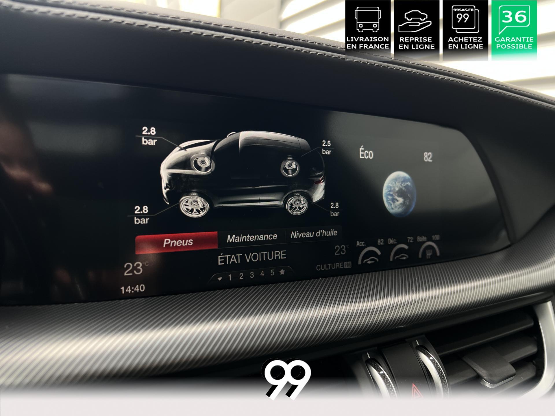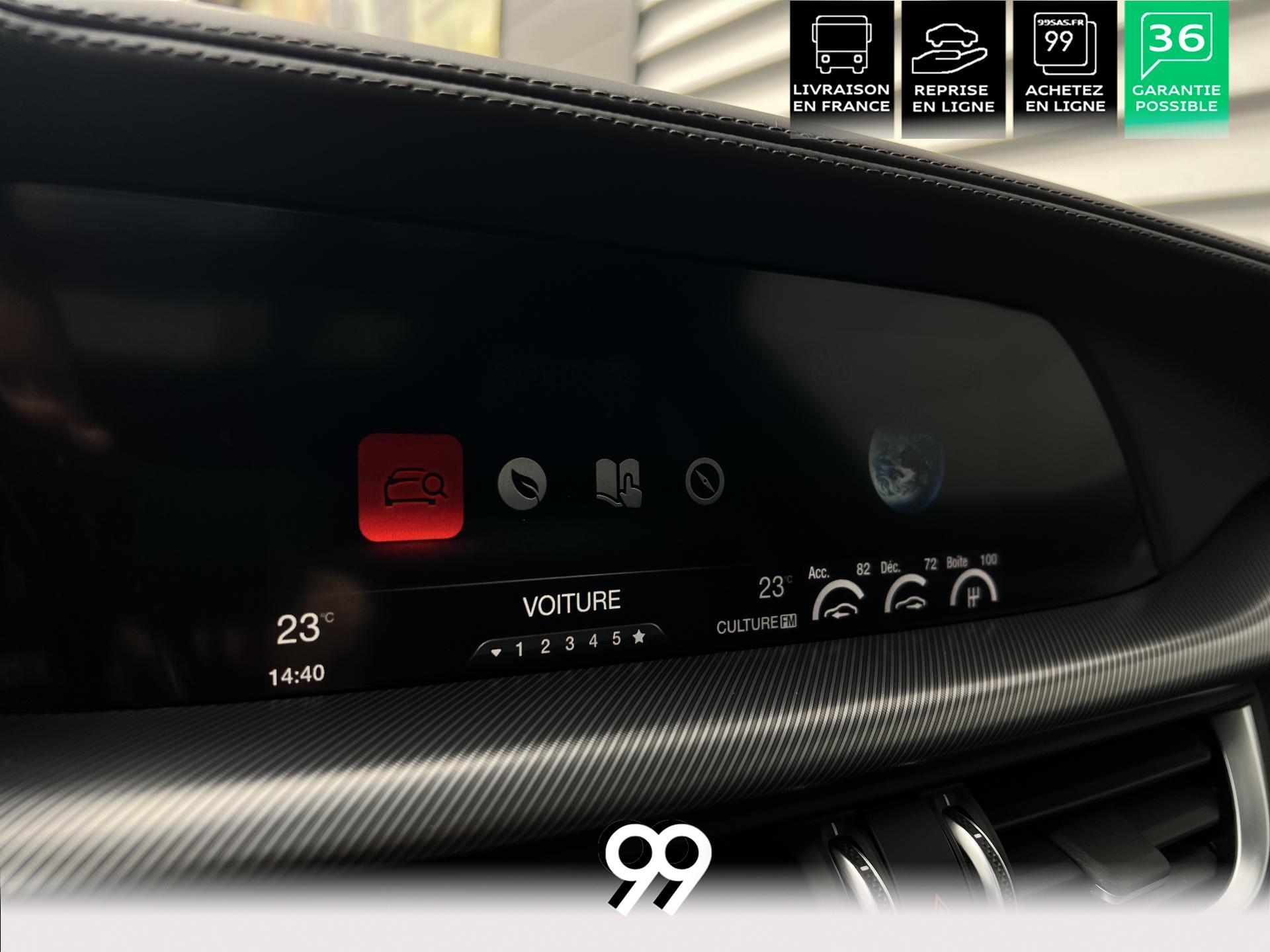 Régulateur adaptatif avec conduite semi-autonome, pack Driver Assistance Plus (caméra, radars, angle mort), suspension dynamique Alfa et palettes aluminium au volant.