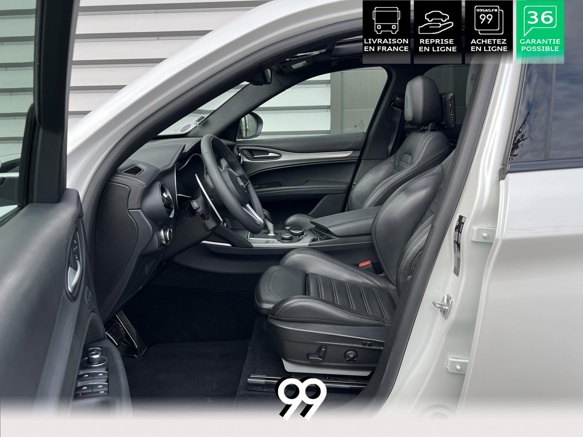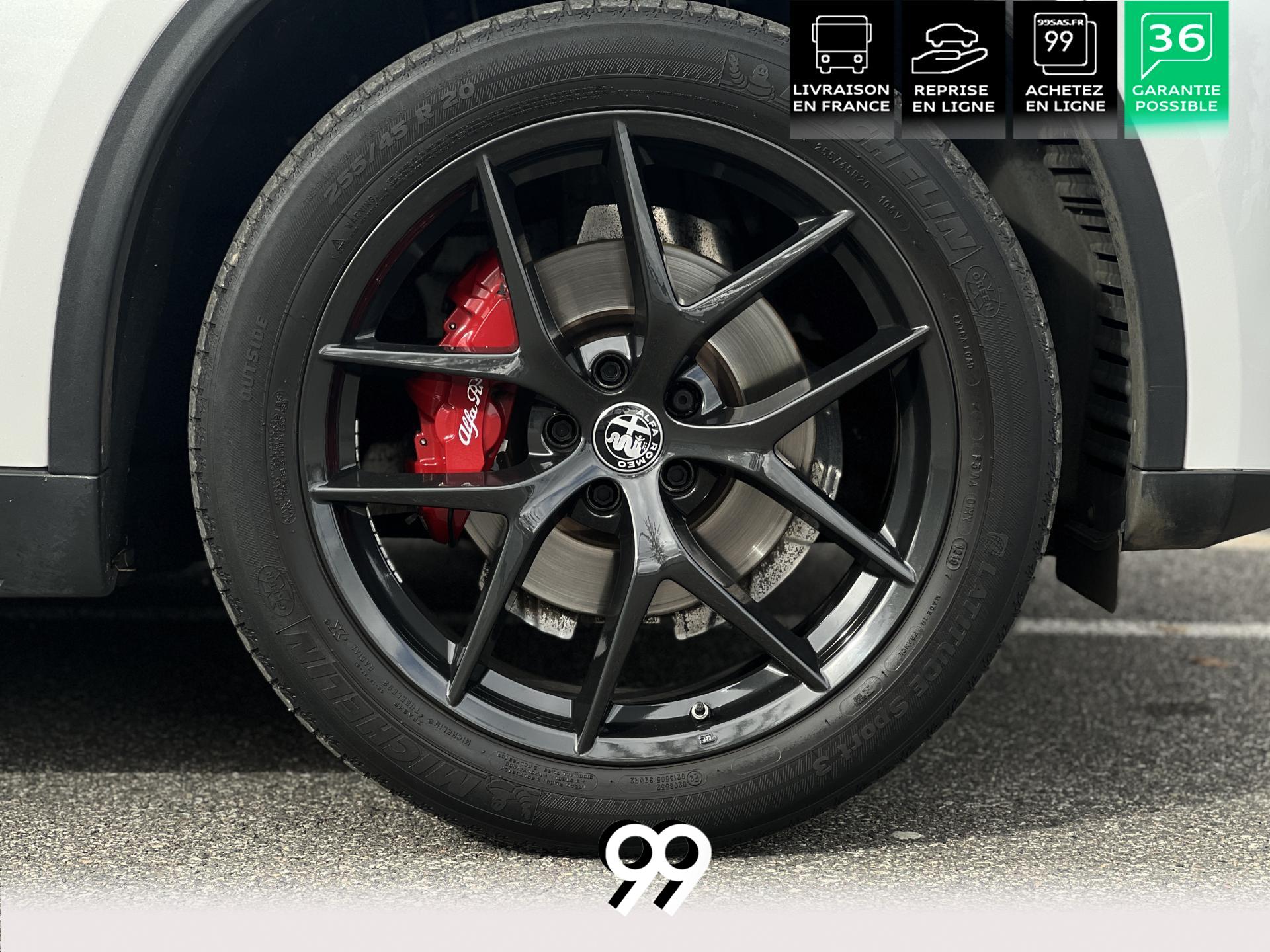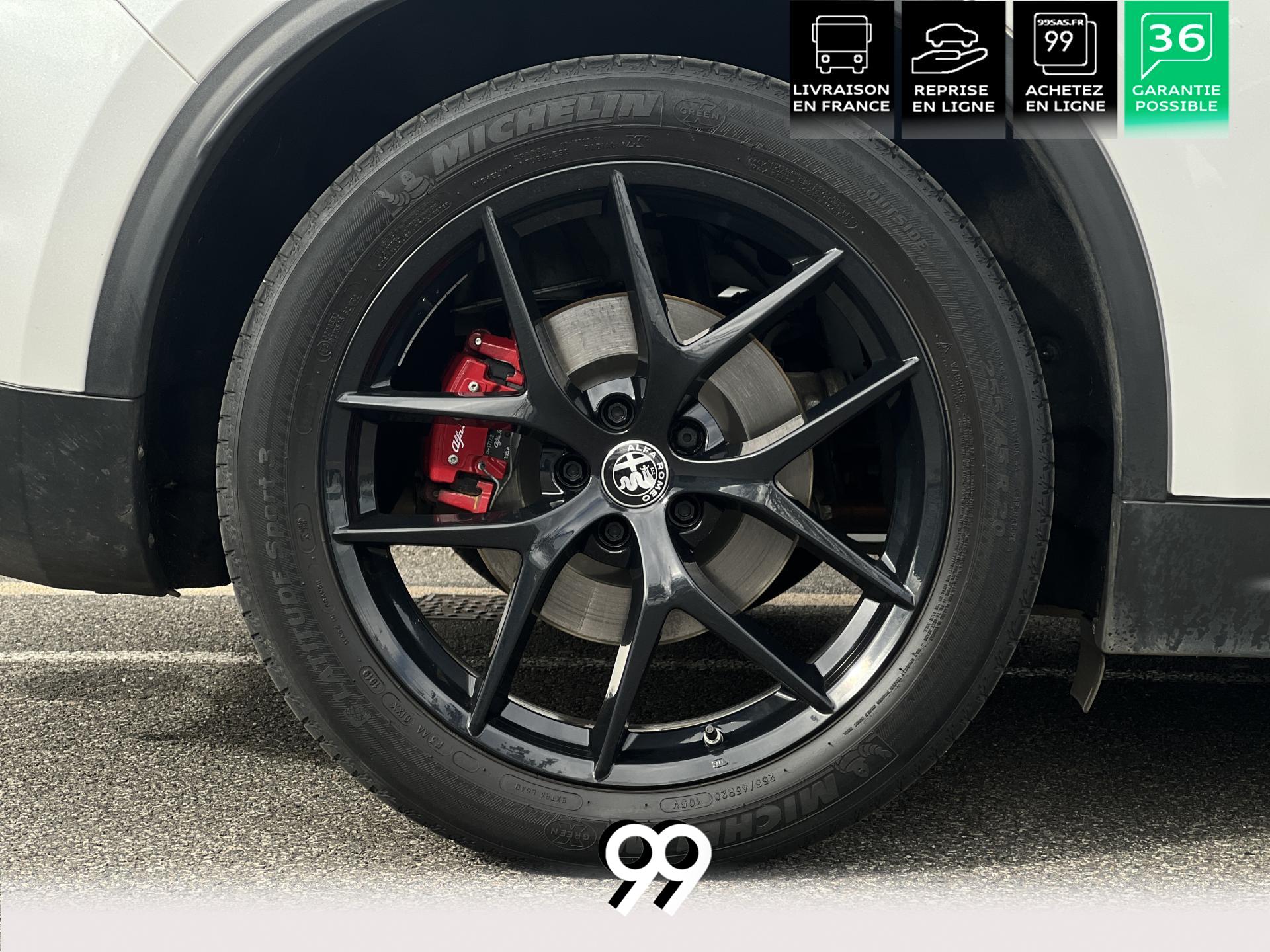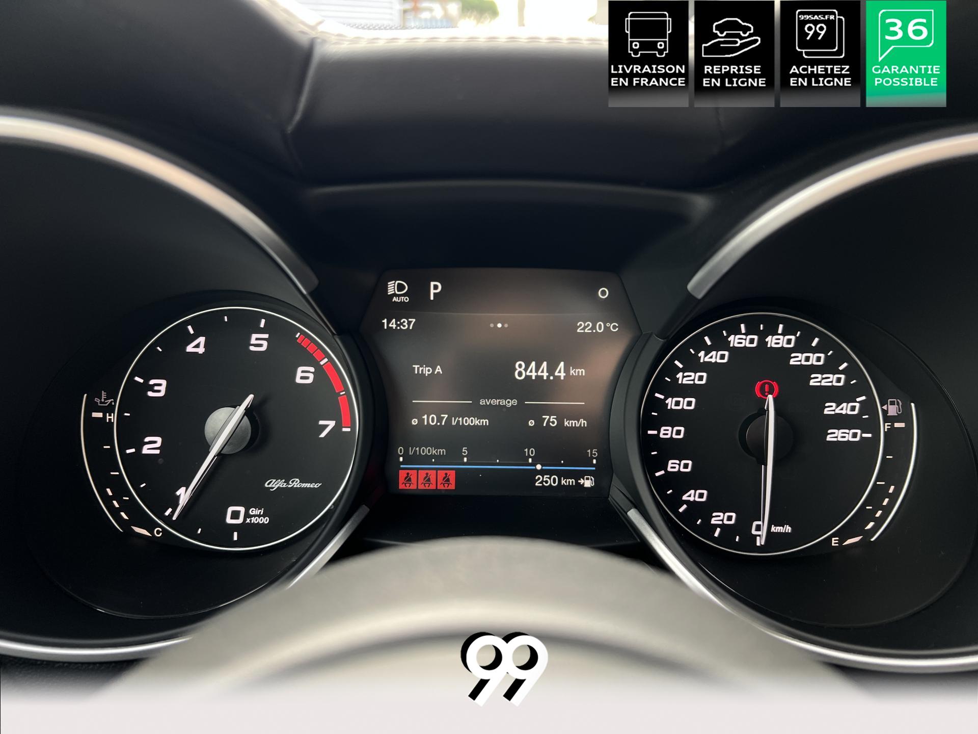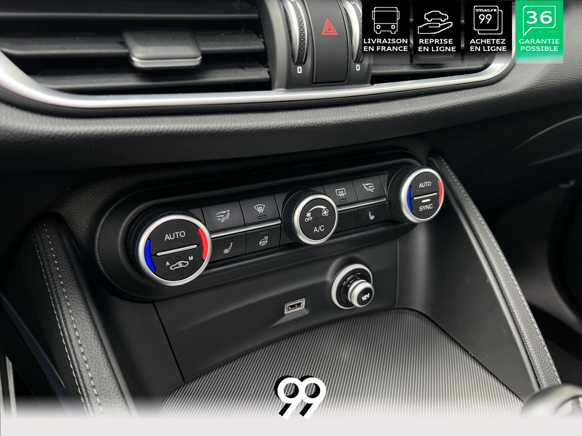 Régulateur adaptatif avec conduite semi-autonome, pack Driver Assistance Plus (caméra, radars, angle mort), suspension dynamique Alfa et palettes aluminium au volant.