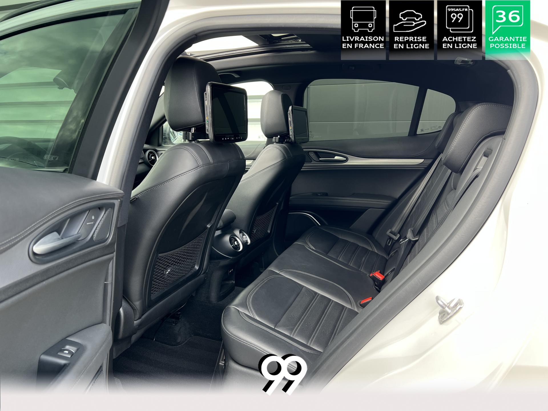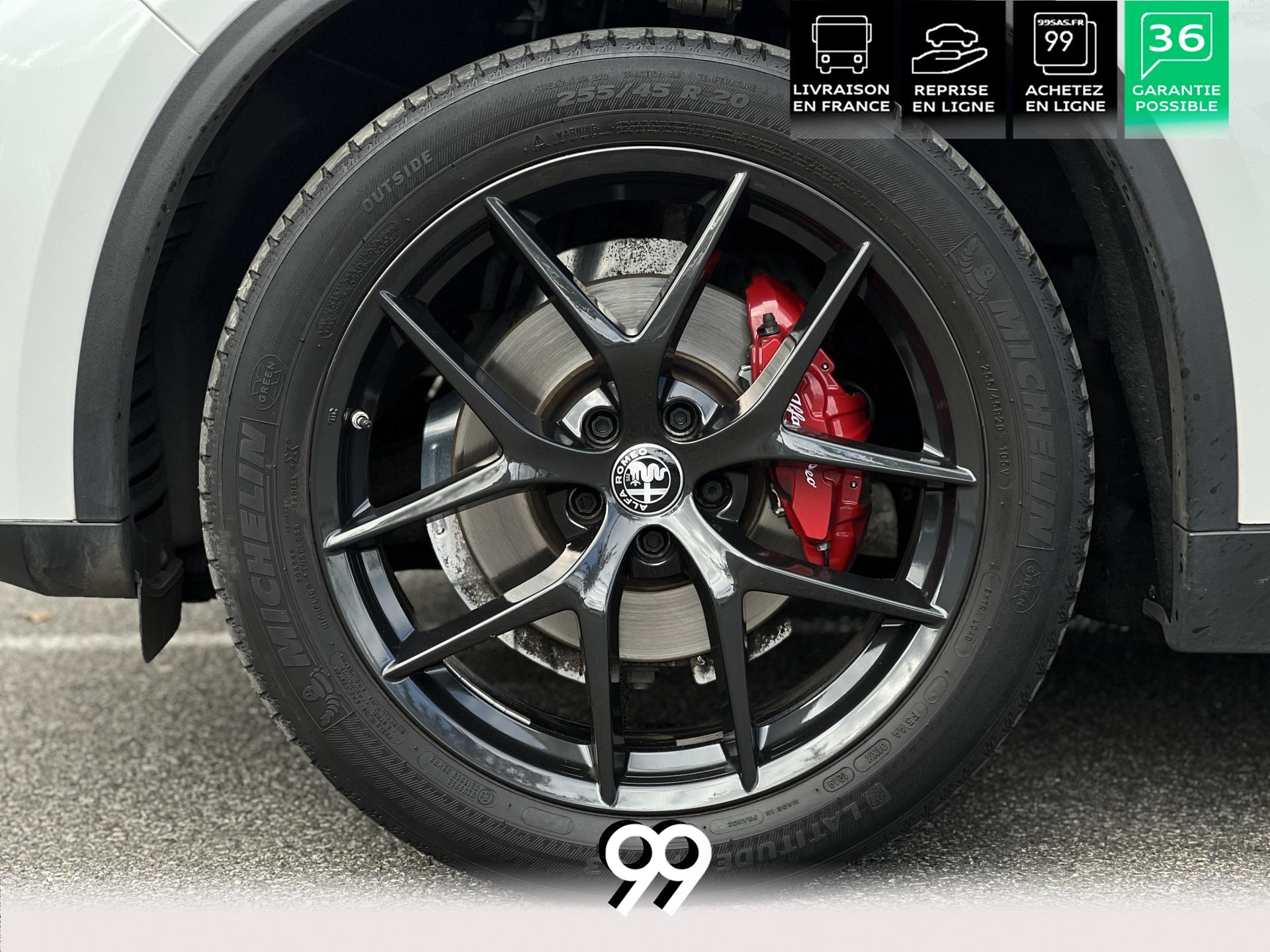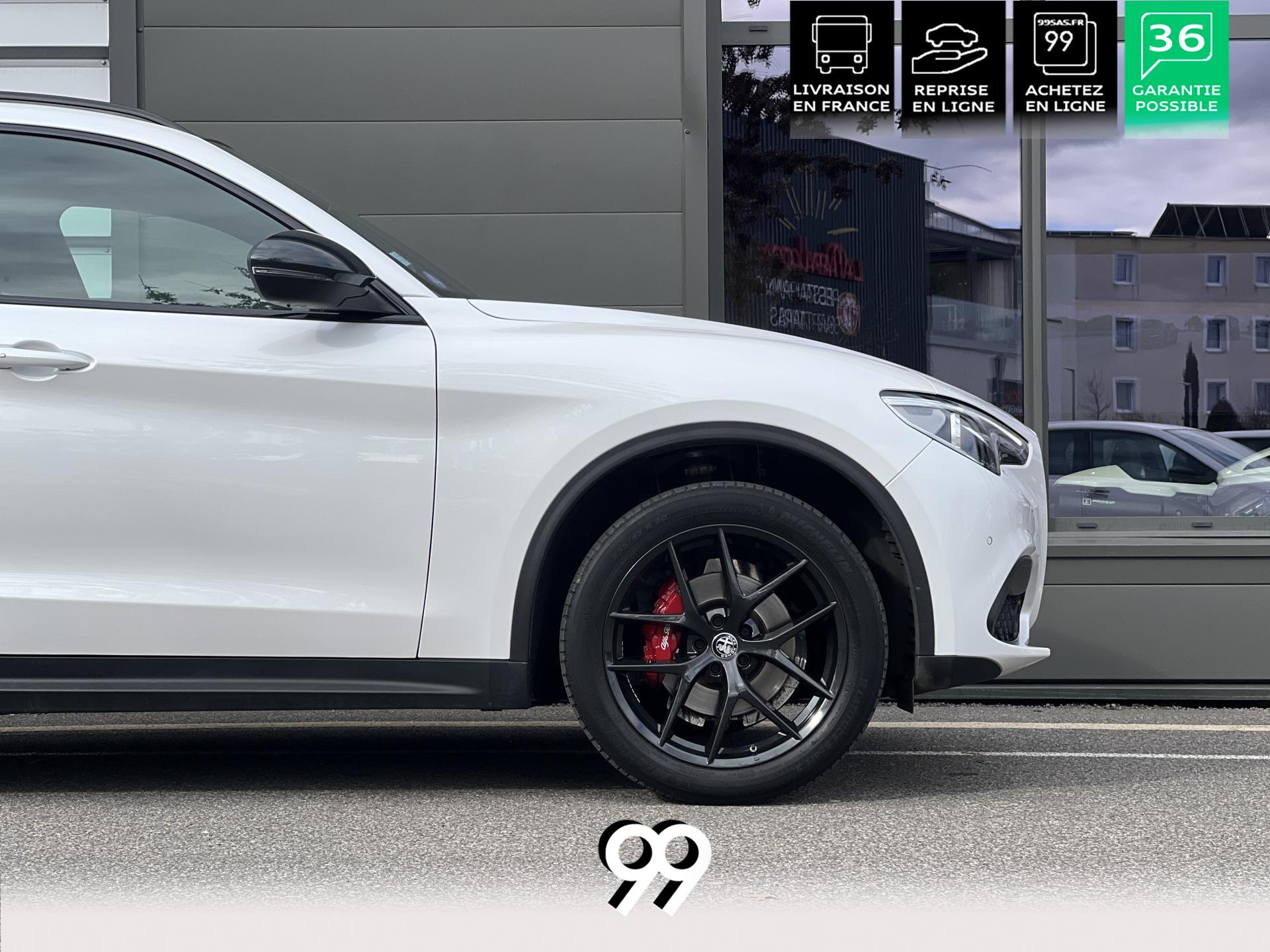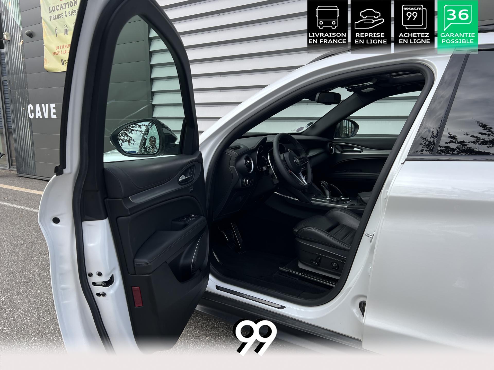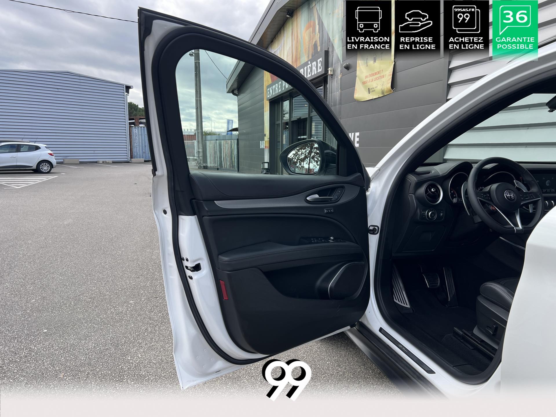 Régulateur adaptatif avec conduite semi-autonome, pack Driver Assistance Plus (caméra, radars, angle mort), suspension dynamique Alfa et palettes aluminium au volant.