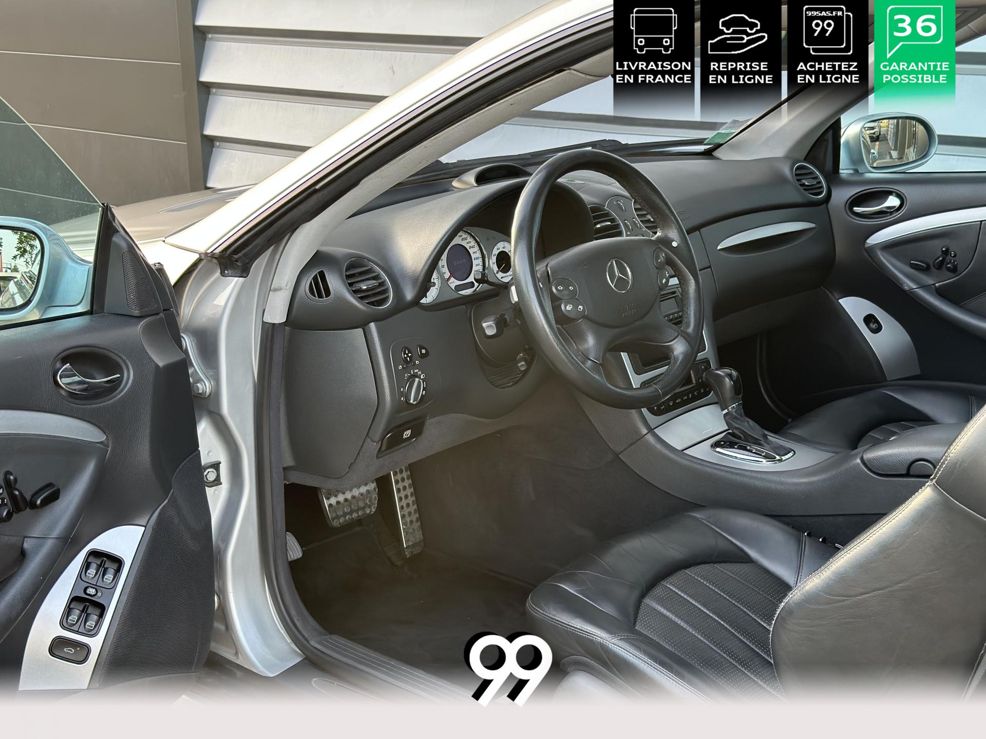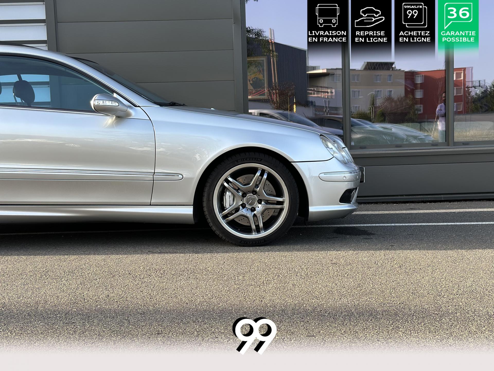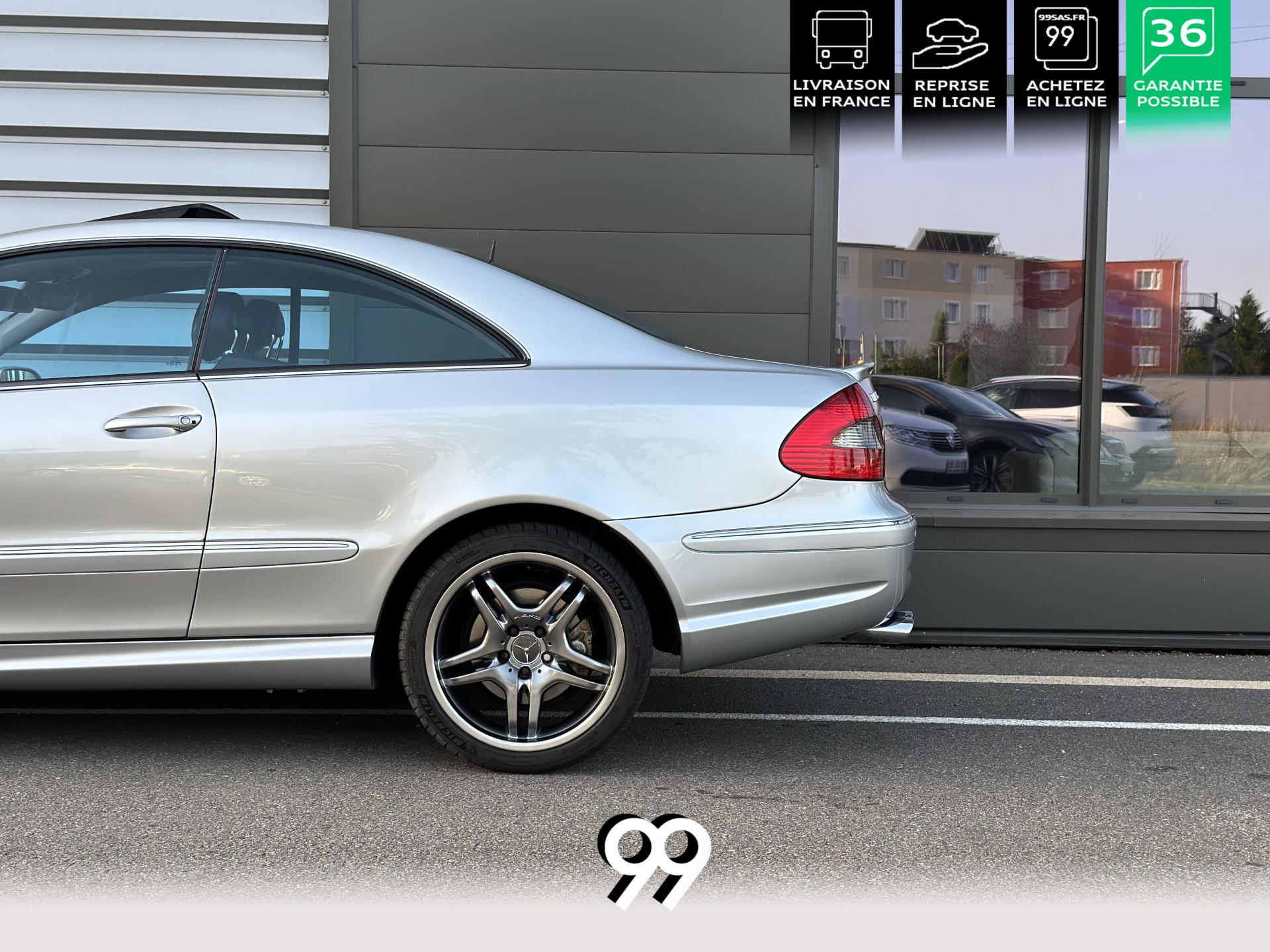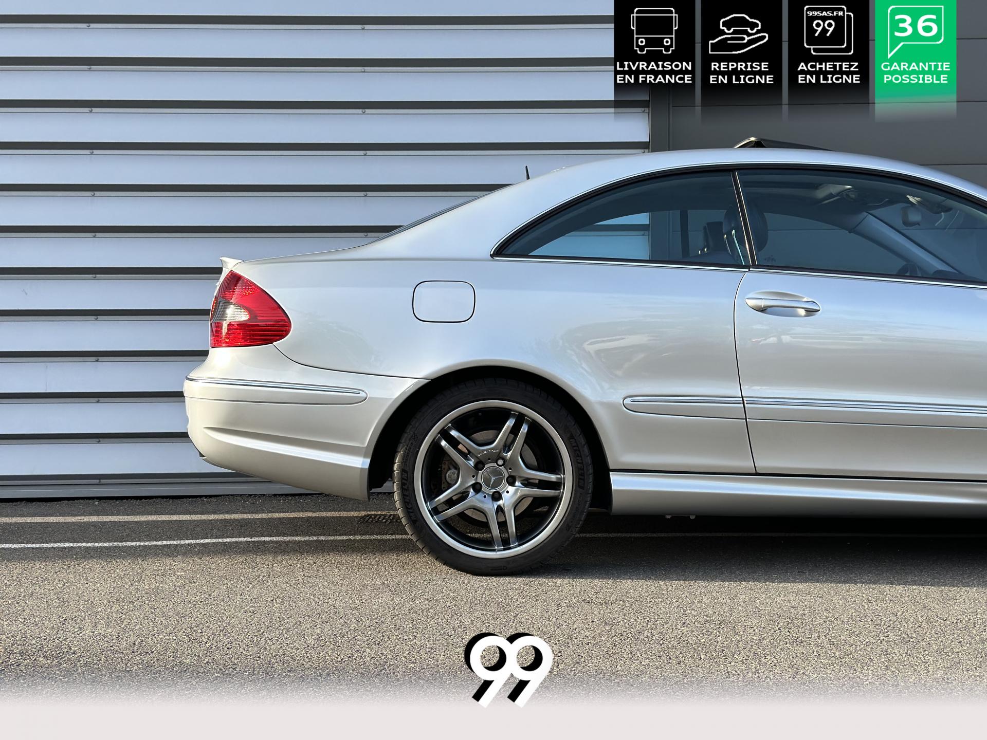 Si sur ses berlines AMG, Mercedes n'est pas très démonstratif sur le plan des artifices de style, les coupés et cabriolets CLK héritent heureusement de quelques accessoires et caractéristiques bienvenus. Ainsi, le bouclier avant se veut très agressif avec ses entrées d'air élargies et ses grilles noires enchâssant les antibrouillards. Des bas de caisse au dessin plus évocateur sont posés et le bouclier arrière est spécialement dessiné pour laisser passer la double sorties d'échappement chromées du V8 atmosphérique. Petit raffinement sportif extrême, un discret becquet de malle arrière a été posé et peint couleur caisse. Le CLK ainsi gréé du kit AMG repose en outre sur de très belles jantes alu de 18" très ajourées qui laissent apparaître les disques de freins percés et ventilés de fort diamètre.