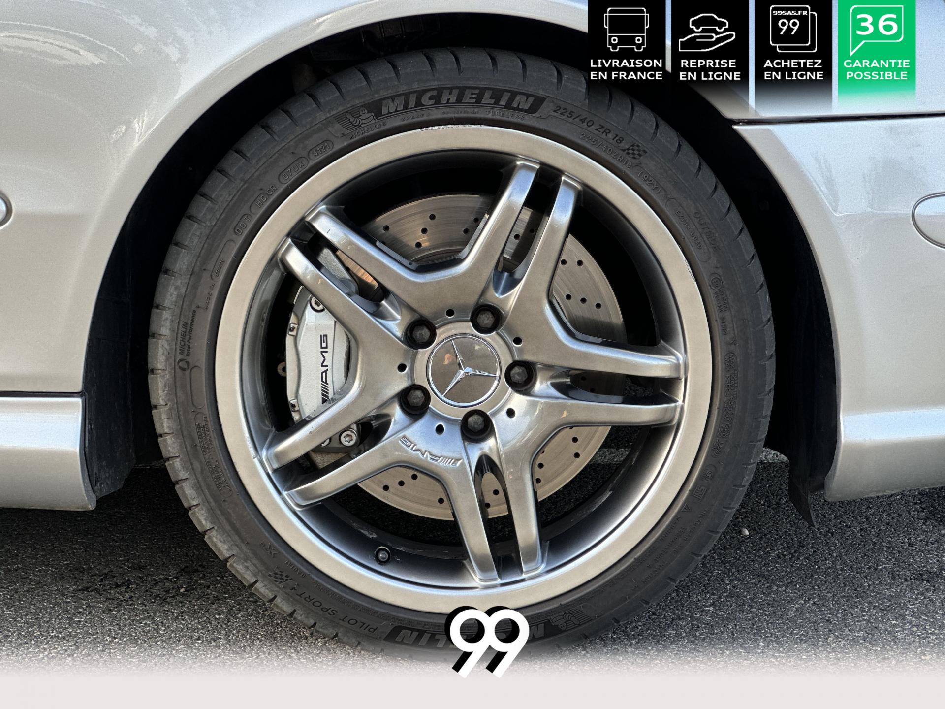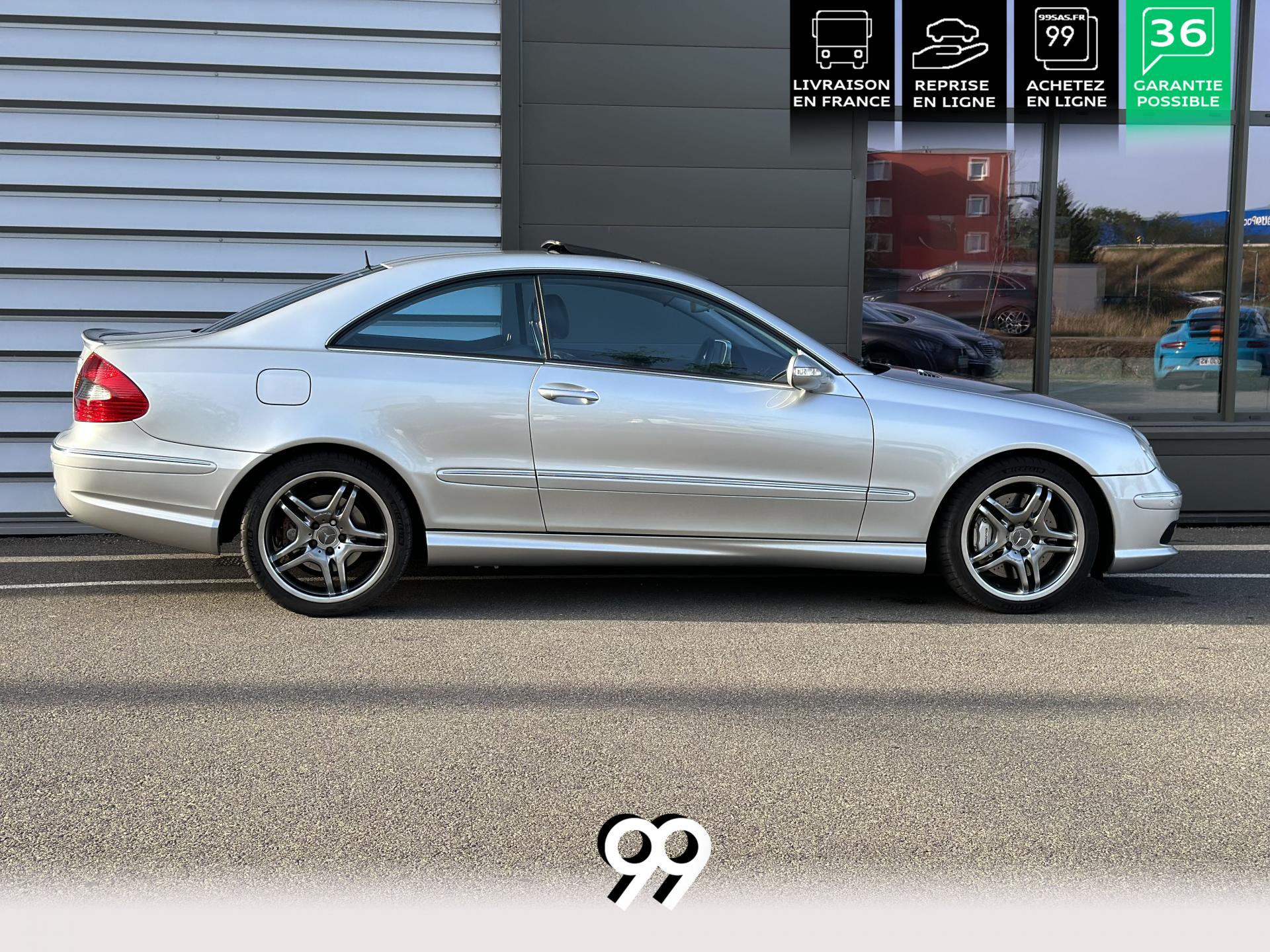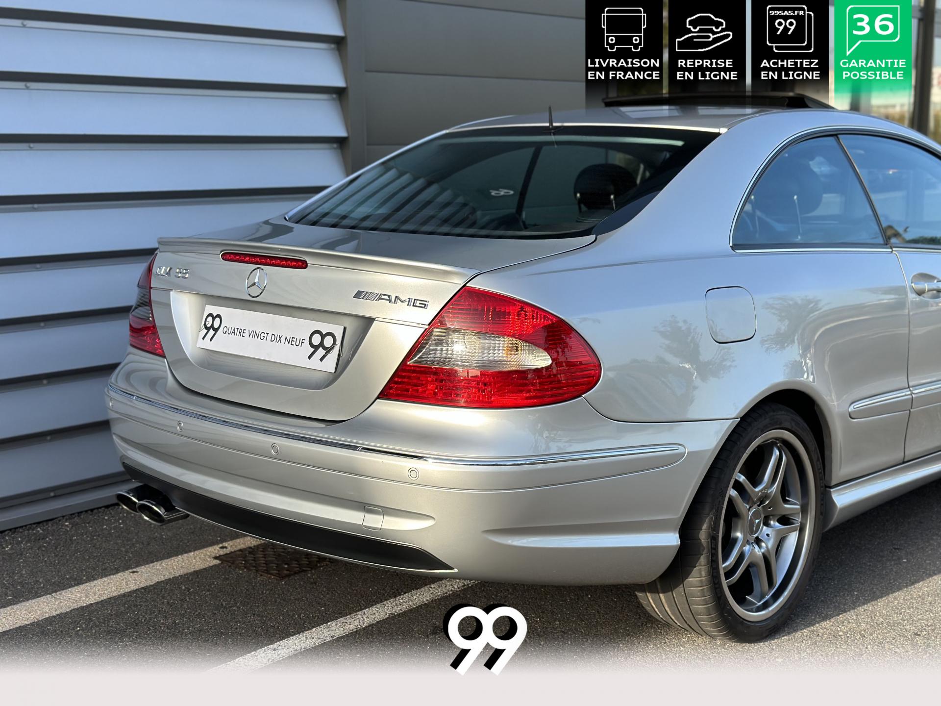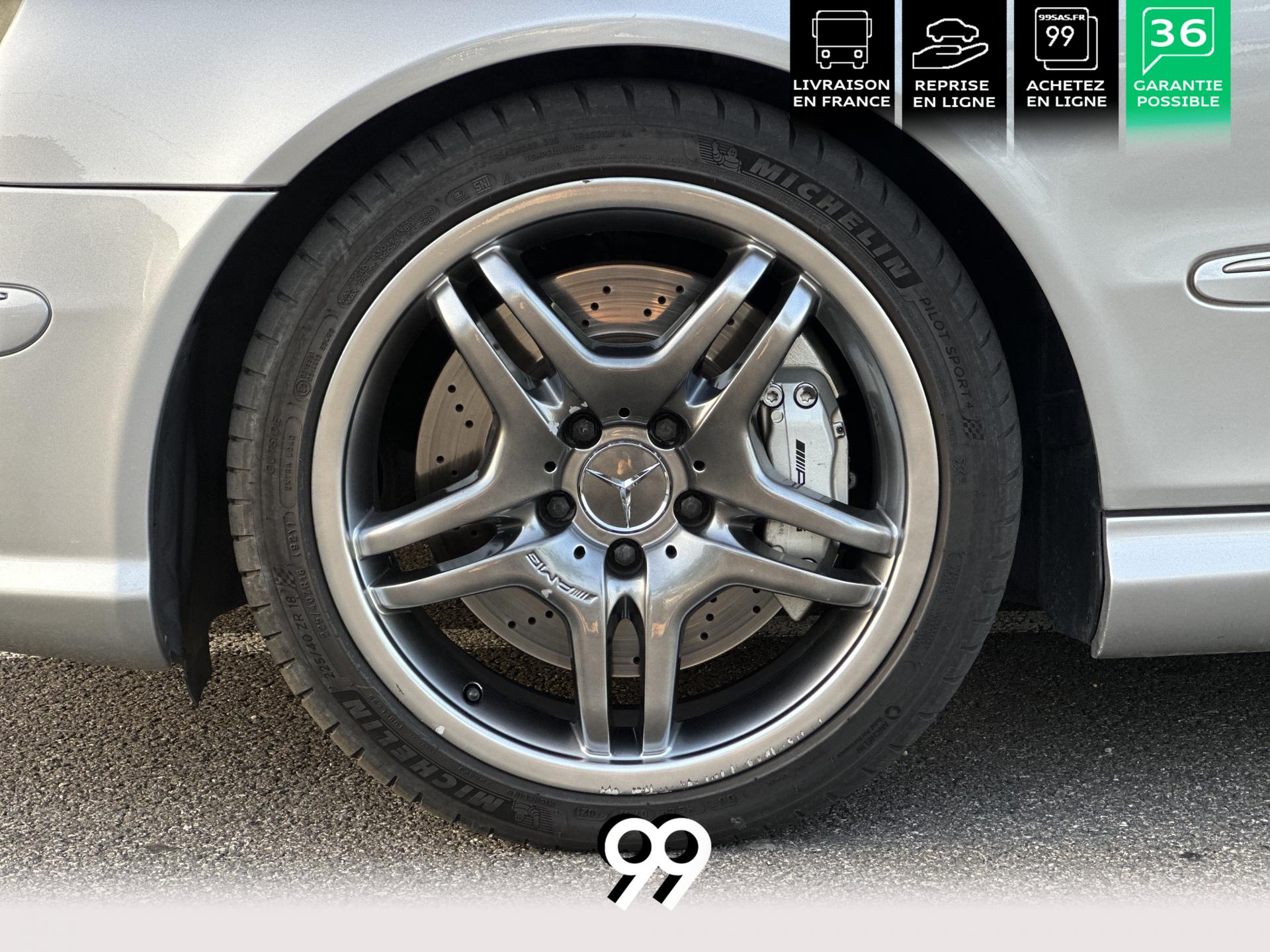 Si sur ses berlines AMG, Mercedes n'est pas très démonstratif sur le plan des artifices de style, les coupés et cabriolets CLK héritent heureusement de quelques accessoires et caractéristiques bienvenus. Ainsi, le bouclier avant se veut très agressif avec ses entrées d'air élargies et ses grilles noires enchâssant les antibrouillards. Des bas de caisse au dessin plus évocateur sont posés et le bouclier arrière est spécialement dessiné pour laisser passer la double sorties d'échappement chromées du V8 atmosphérique. Petit raffinement sportif extrême, un discret becquet de malle arrière a été posé et peint couleur caisse. Le CLK ainsi gréé du kit AMG repose en outre sur de très belles jantes alu de 18" très ajourées qui laissent apparaître les disques de freins percés et ventilés de fort diamètre.