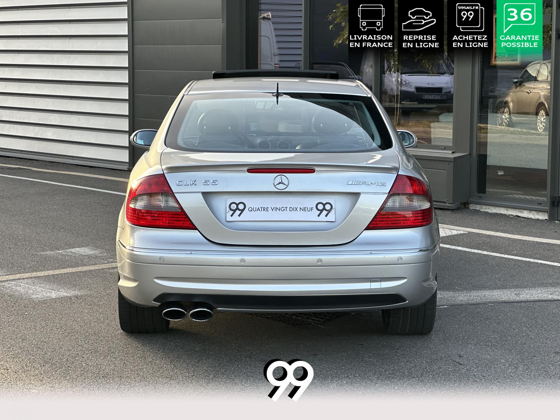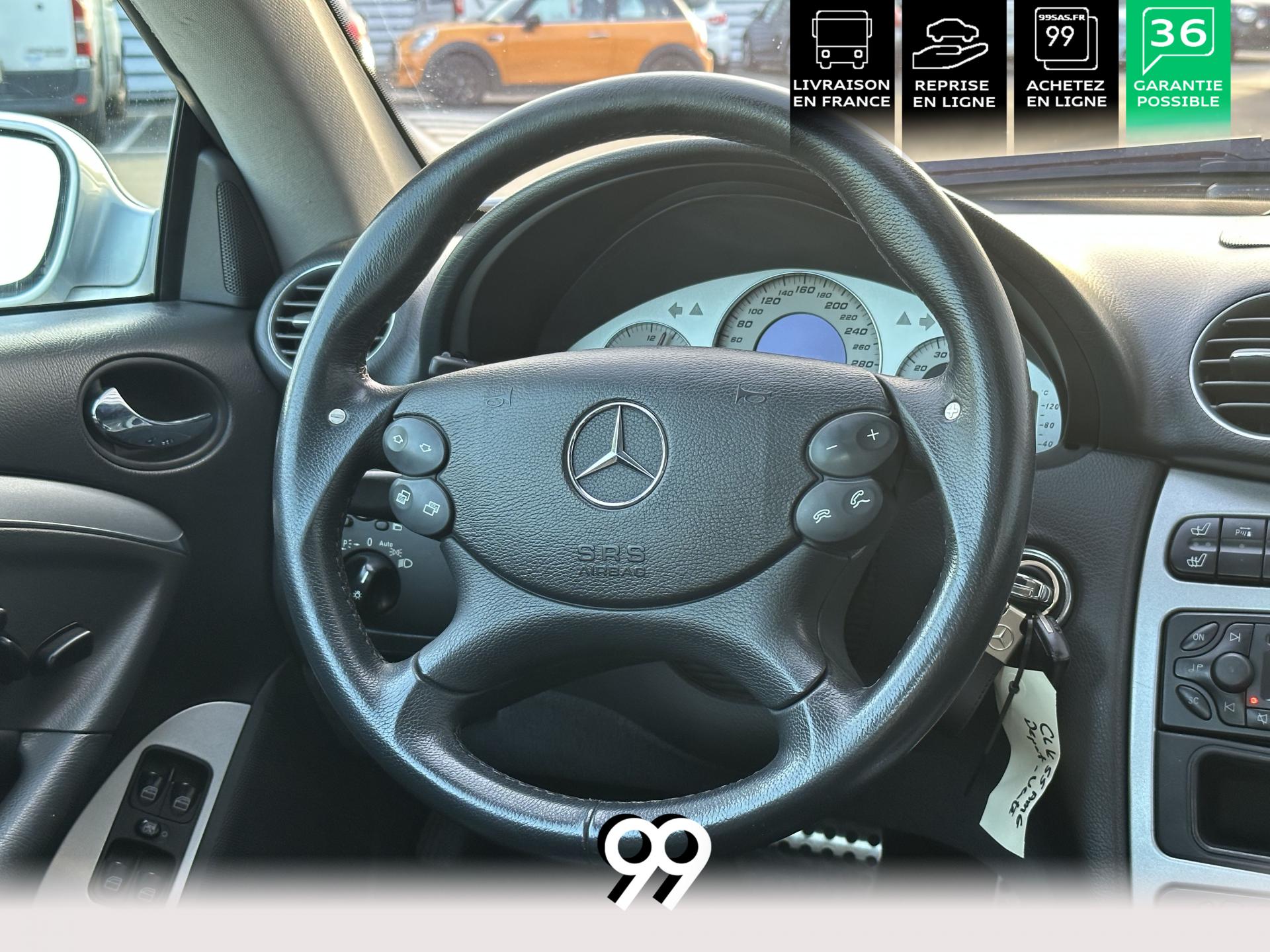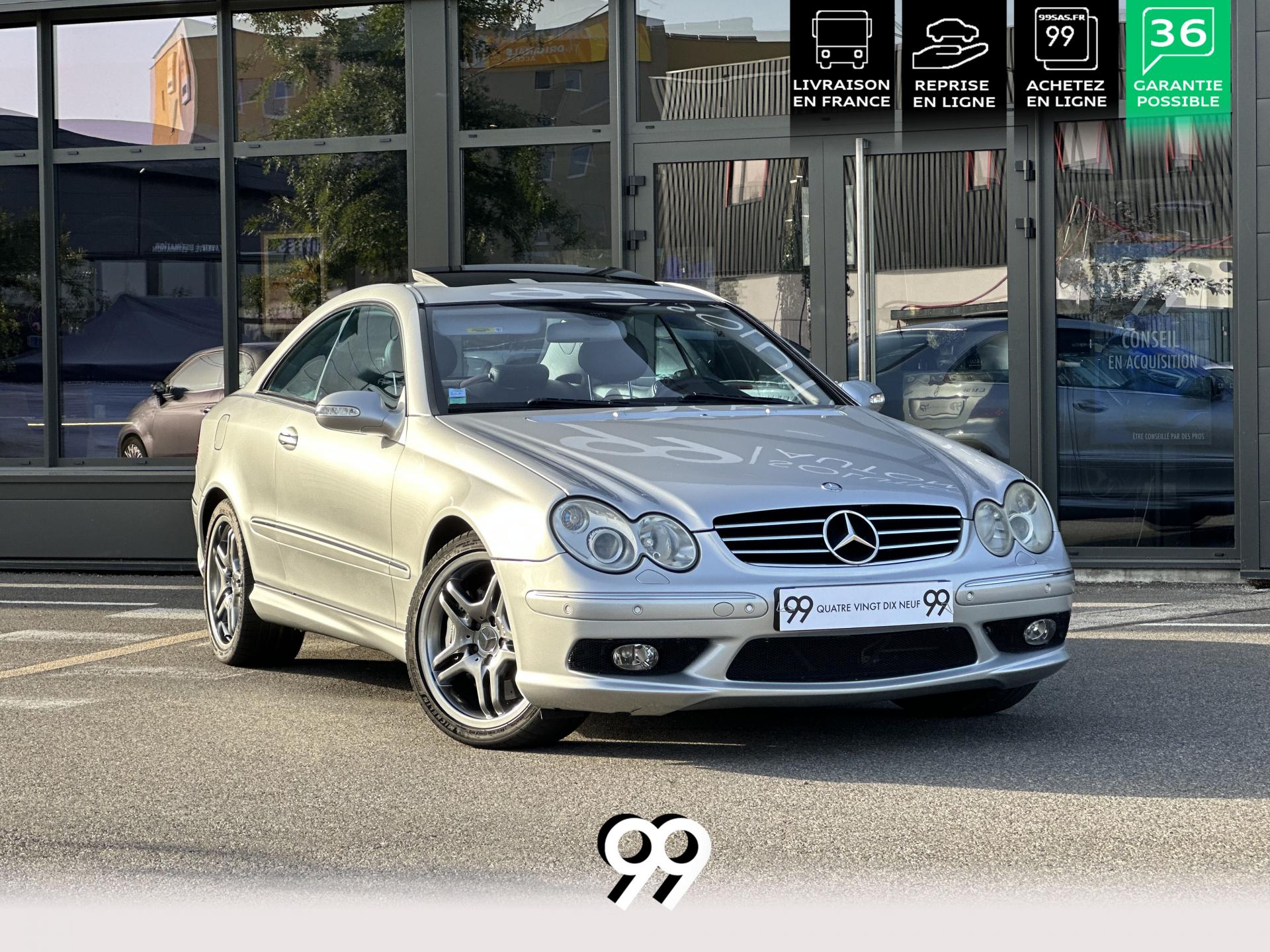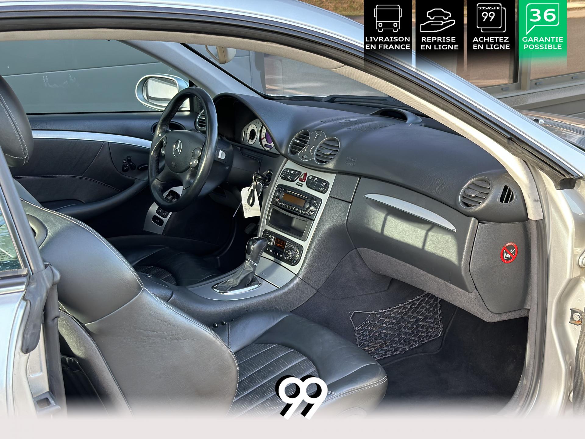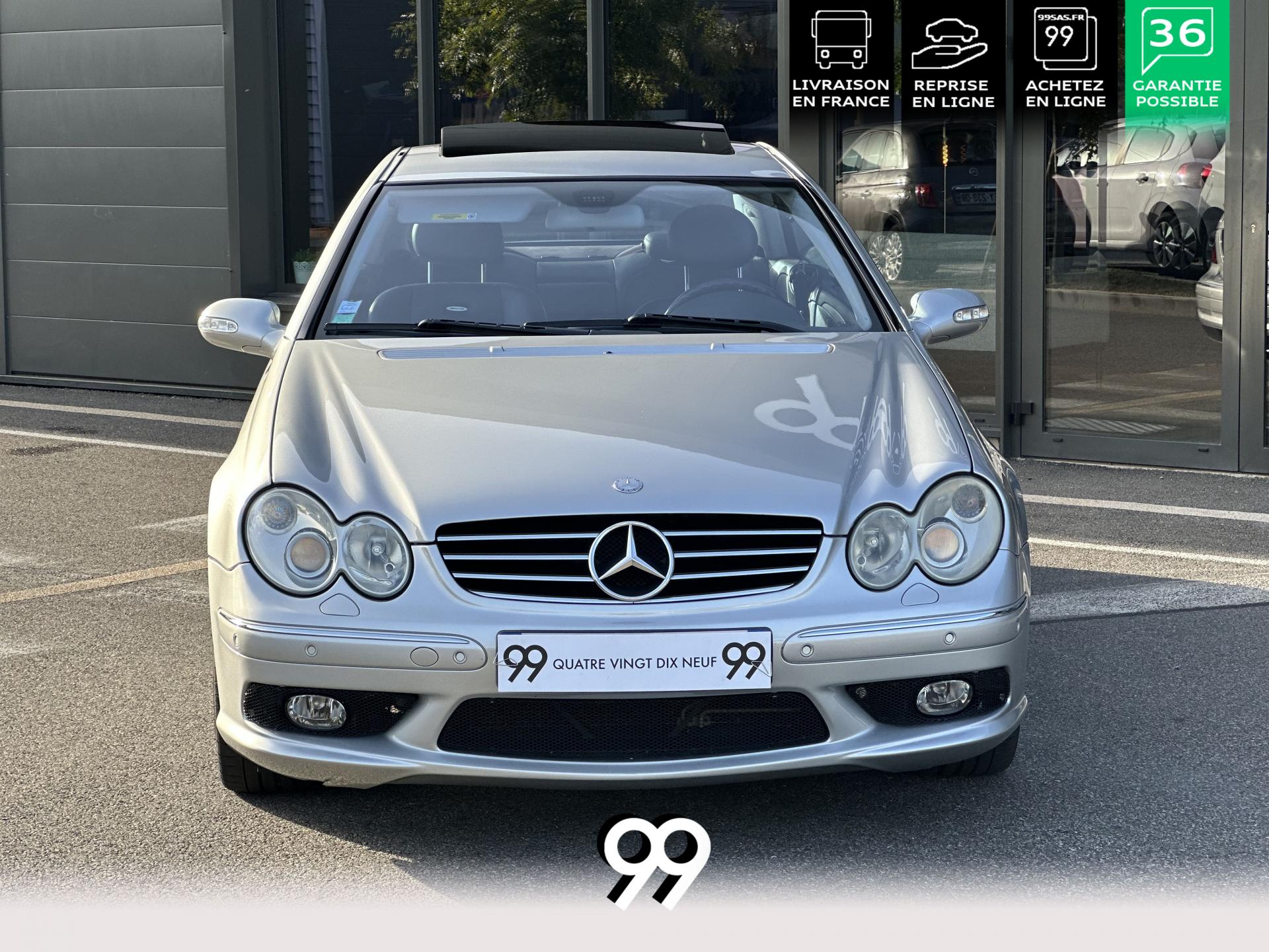 Si sur ses berlines AMG, Mercedes n'est pas très démonstratif sur le plan des artifices de style, les coupés et cabriolets CLK héritent heureusement de quelques accessoires et caractéristiques bienvenus. Ainsi, le bouclier avant se veut très agressif avec ses entrées d'air élargies et ses grilles noires enchâssant les antibrouillards. Des bas de caisse au dessin plus évocateur sont posés et le bouclier arrière est spécialement dessiné pour laisser passer la double sorties d'échappement chromées du V8 atmosphérique. Petit raffinement sportif extrême, un discret becquet de malle arrière a été posé et peint couleur caisse. Le CLK ainsi gréé du kit AMG repose en outre sur de très belles jantes alu de 18" très ajourées qui laissent apparaître les disques de freins percés et ventilés de fort diamètre.