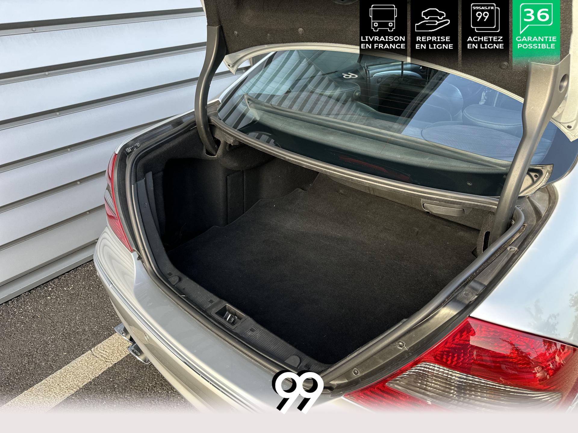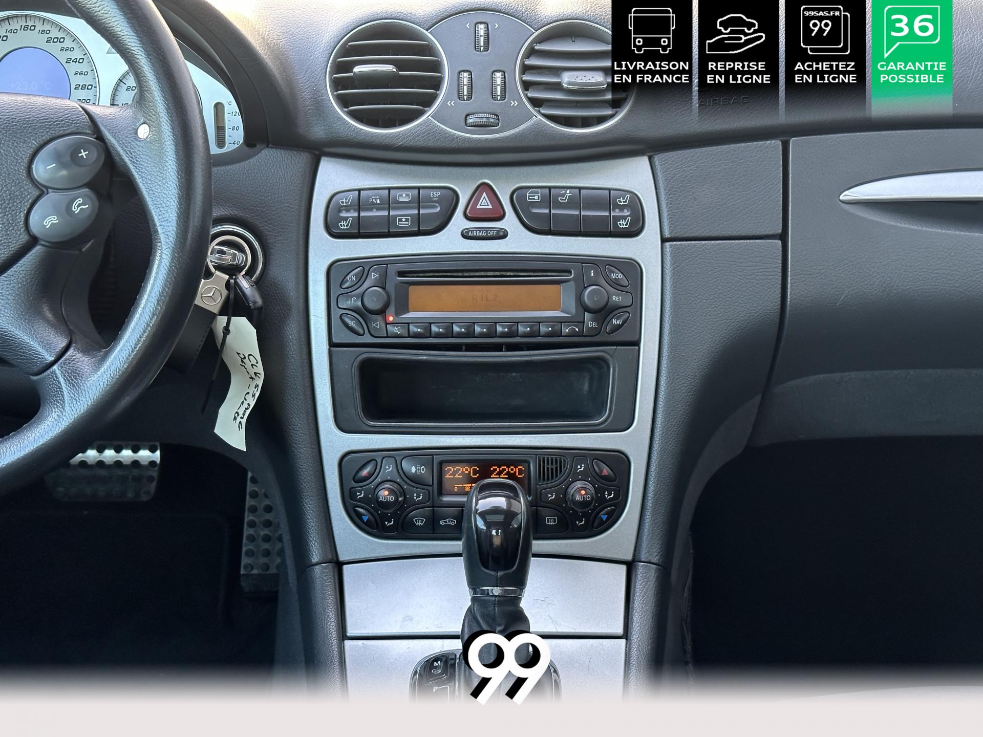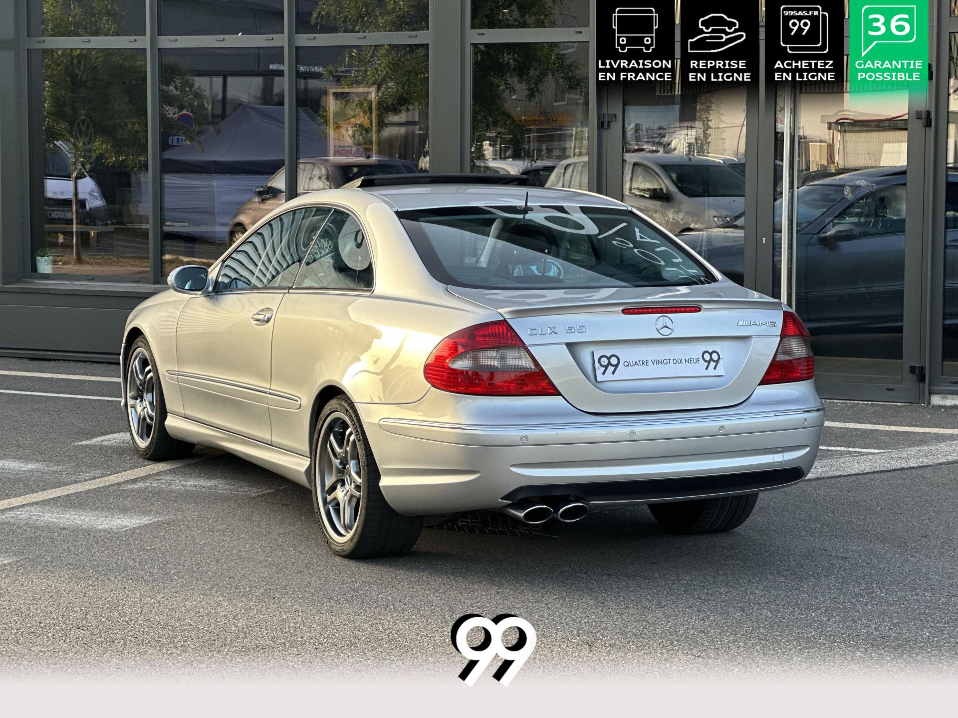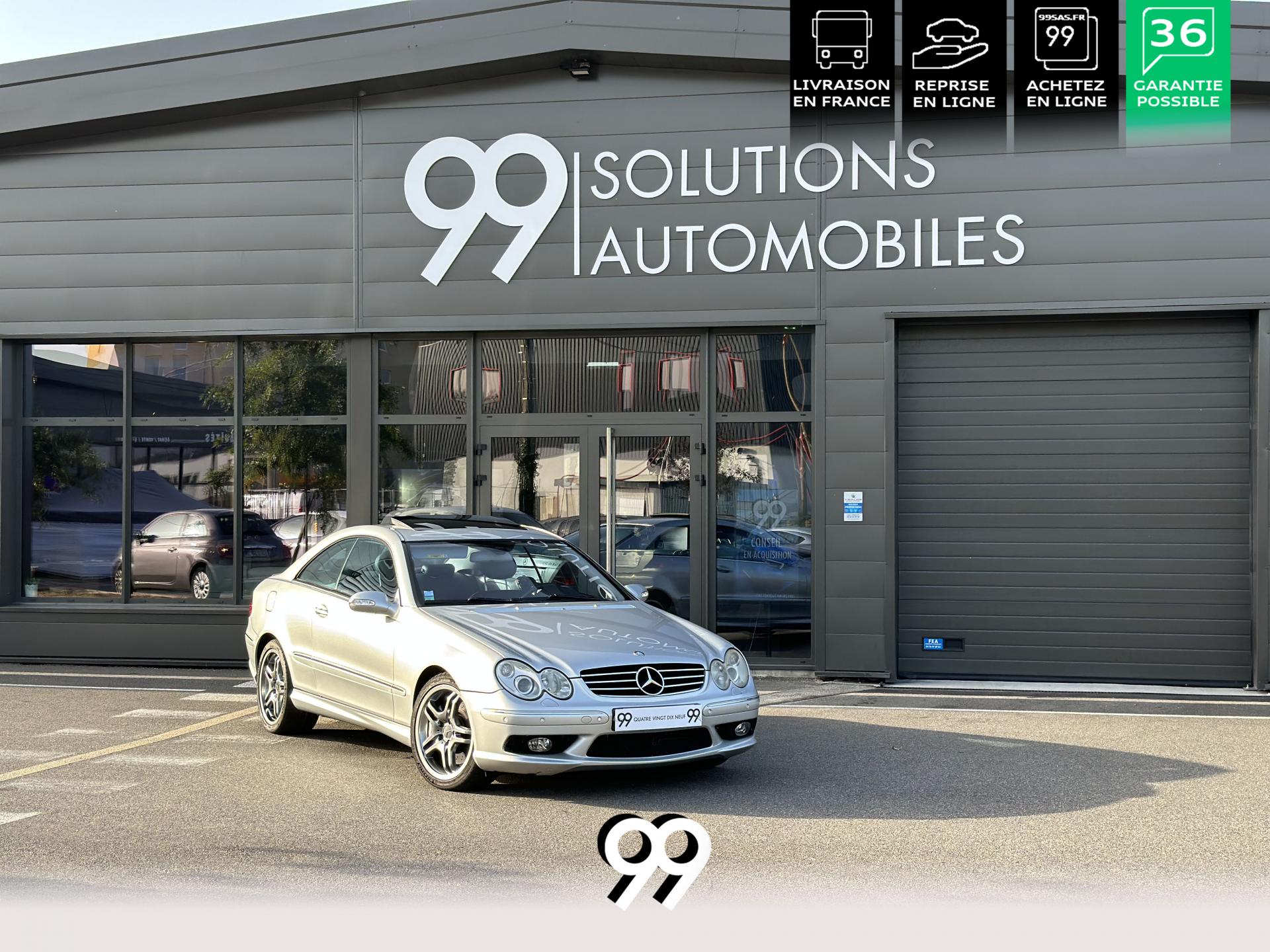 Si sur ses berlines AMG, Mercedes n'est pas très démonstratif sur le plan des artifices de style, les coupés et cabriolets CLK héritent heureusement de quelques accessoires et caractéristiques bienvenus. Ainsi, le bouclier avant se veut très agressif avec ses entrées d'air élargies et ses grilles noires enchâssant les antibrouillards. Des bas de caisse au dessin plus évocateur sont posés et le bouclier arrière est spécialement dessiné pour laisser passer la double sorties d'échappement chromées du V8 atmosphérique. Petit raffinement sportif extrême, un discret becquet de malle arrière a été posé et peint couleur caisse. Le CLK ainsi gréé du kit AMG repose en outre sur de très belles jantes alu de 18" très ajourées qui laissent apparaître les disques de freins percés et ventilés de fort diamètre.