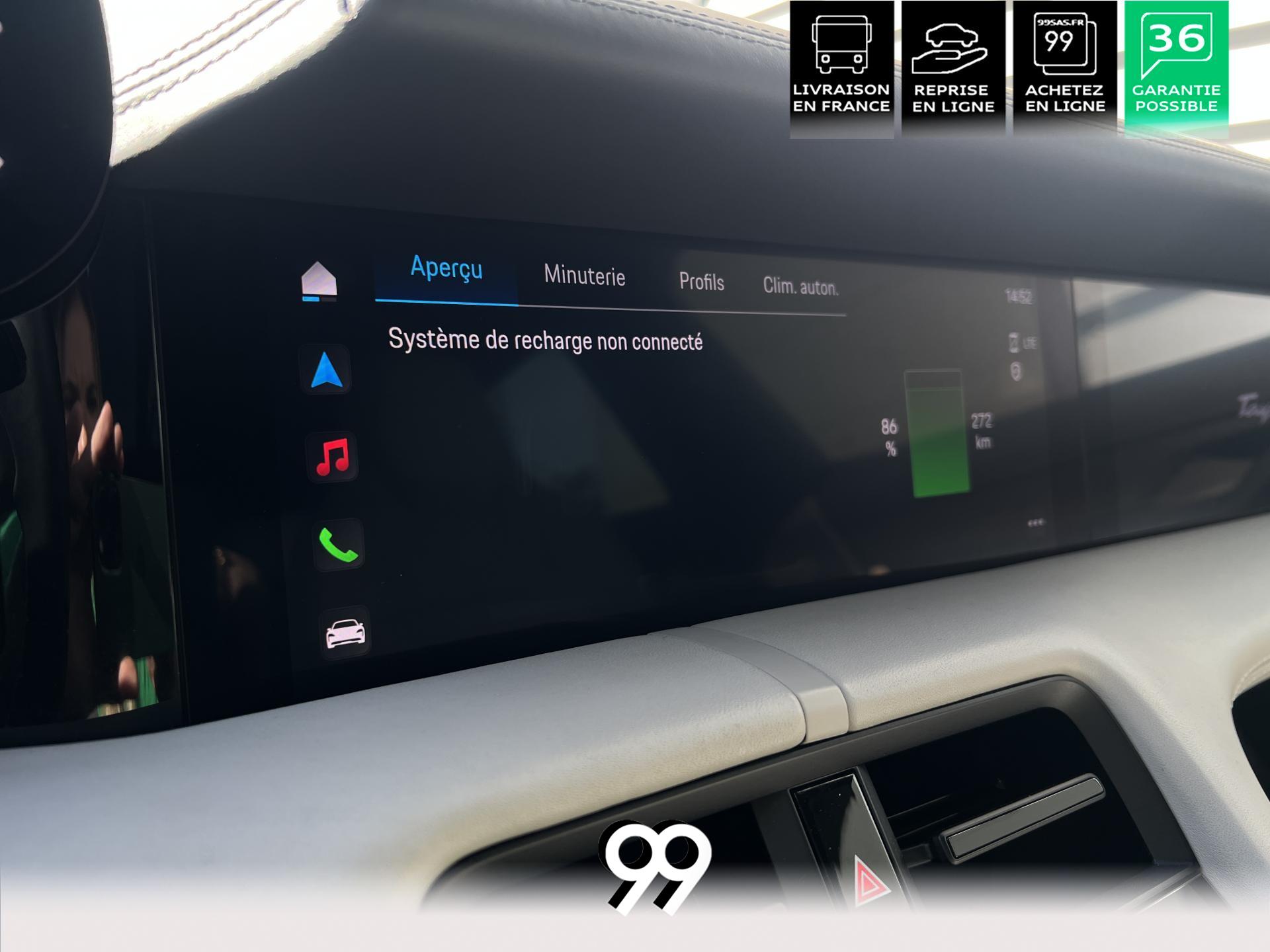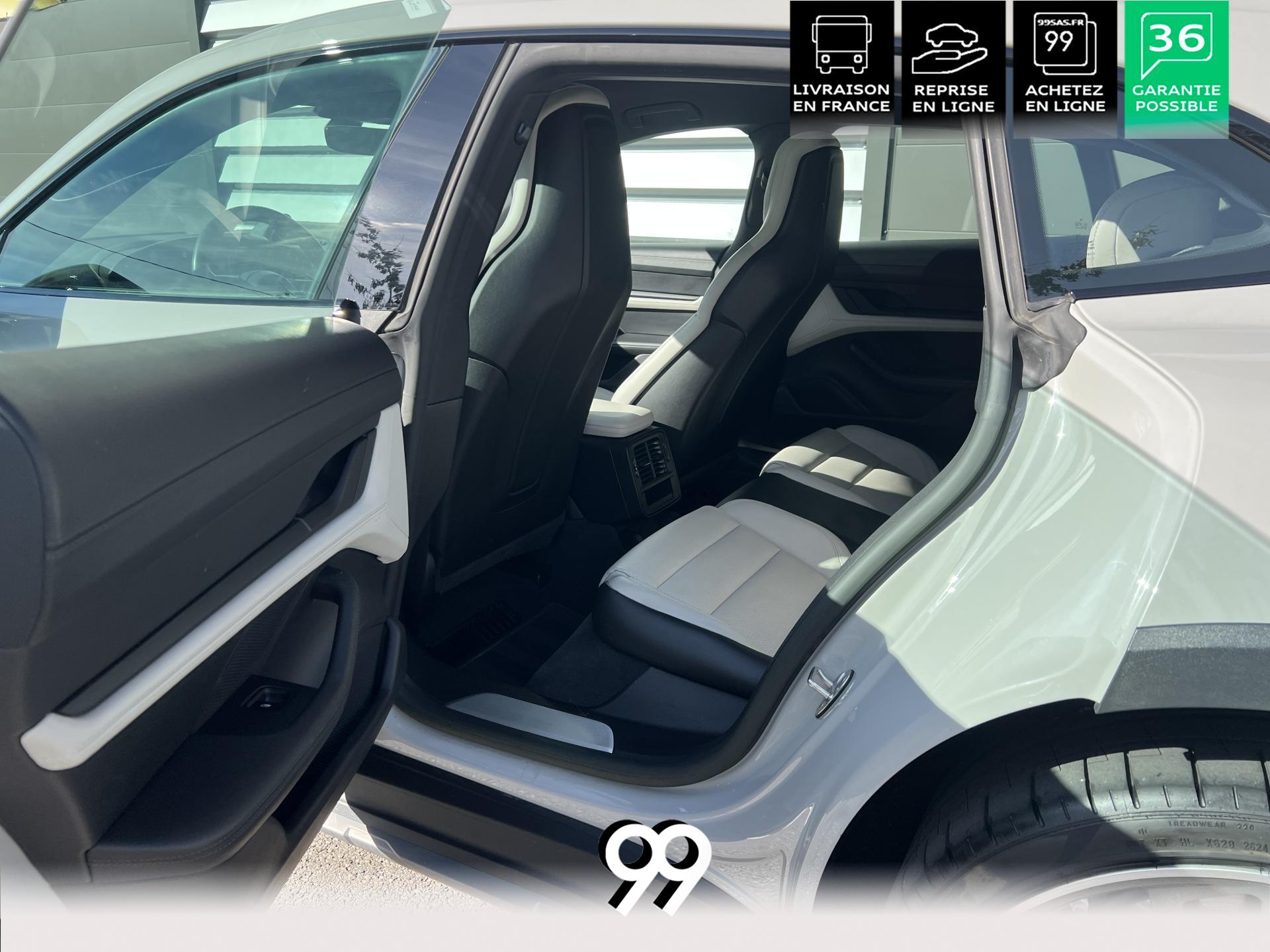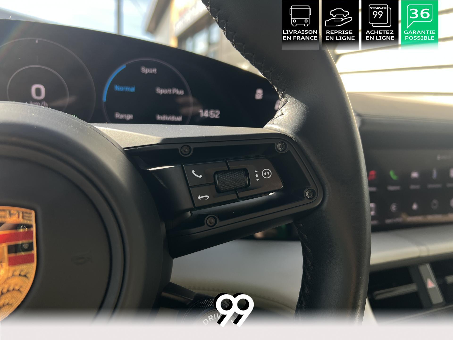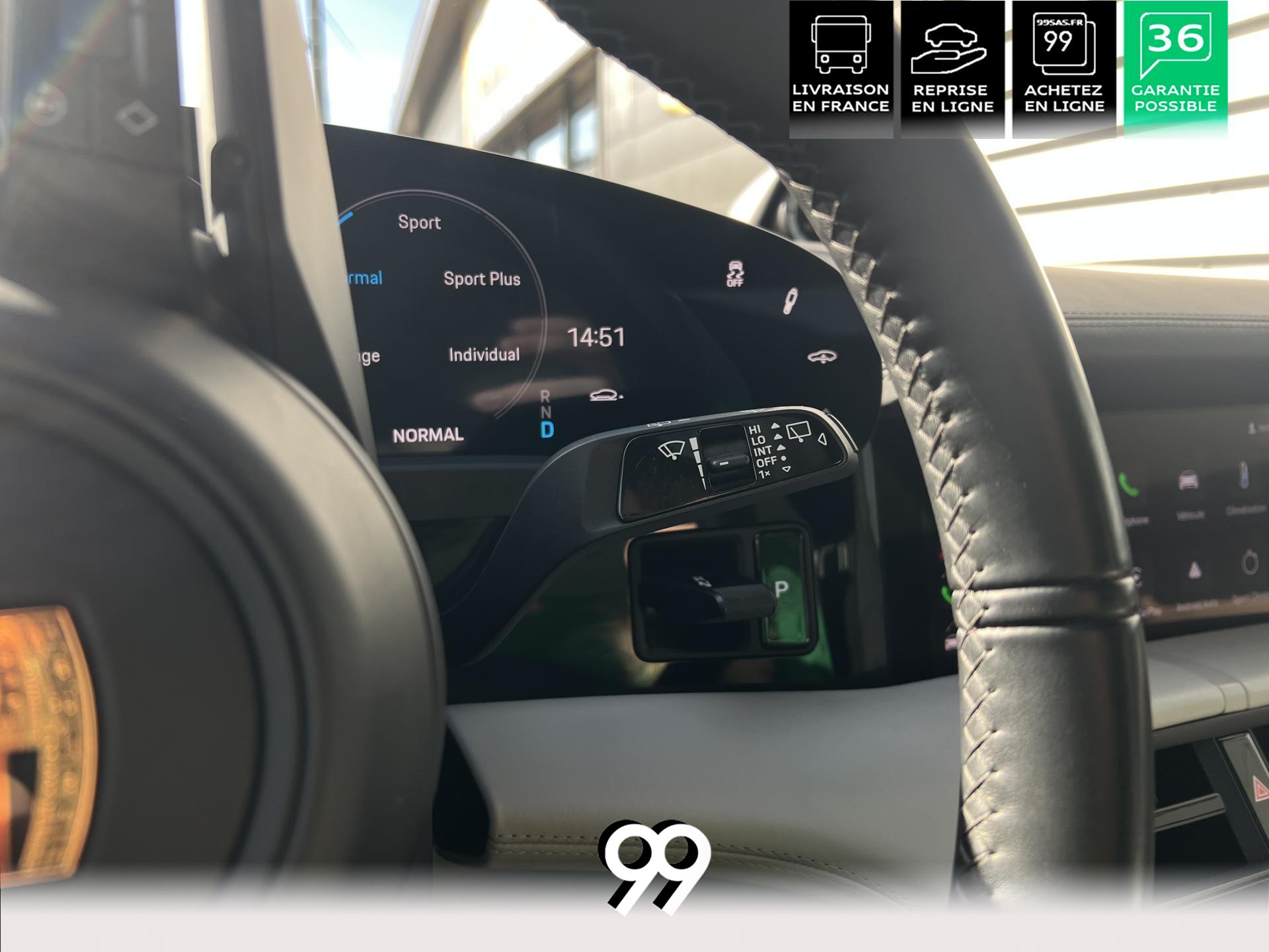 Toit panoramique fixe, accès confort sans clé, écran passager tactile 10,9", configuration 4+1 places, sièges avant chauffants, pack mémoire conducteur, éclairage d’ambiance et rétroviseurs anti-éblouissement composent un habitacle haut de gamme. Côté recharge : chargeur embarqué 22 kW, câble type 2, trappe électrique et Porsche Intelligent Range Manager optimisent l’autonomie.
